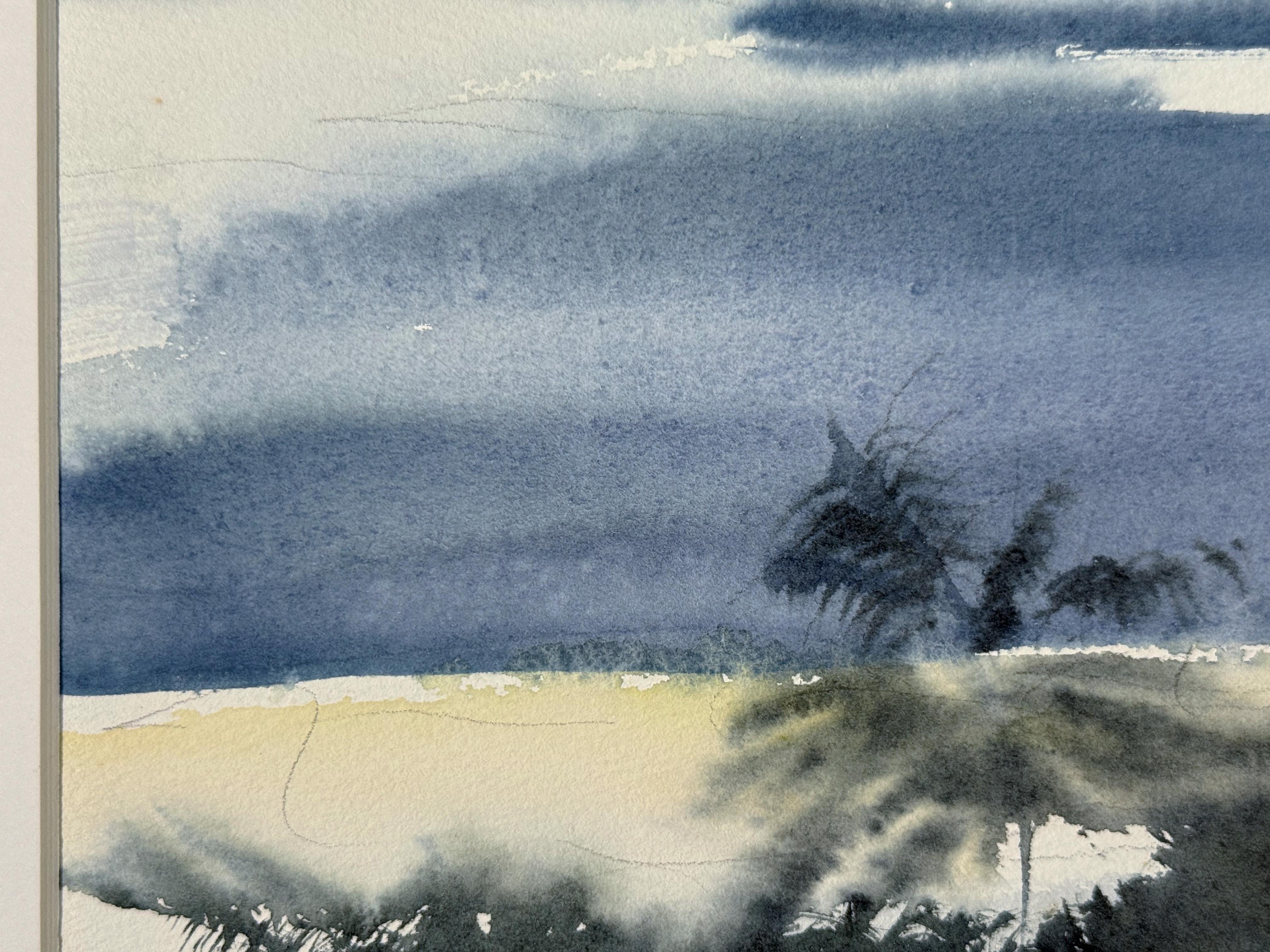 "Nuvole pesanti" è un paesaggio drammatico e coinvolgente eseguito ad acquerello, che cattura l'immensa potenza e il movimento di un vasto cielo che incontra un campo fertile.
