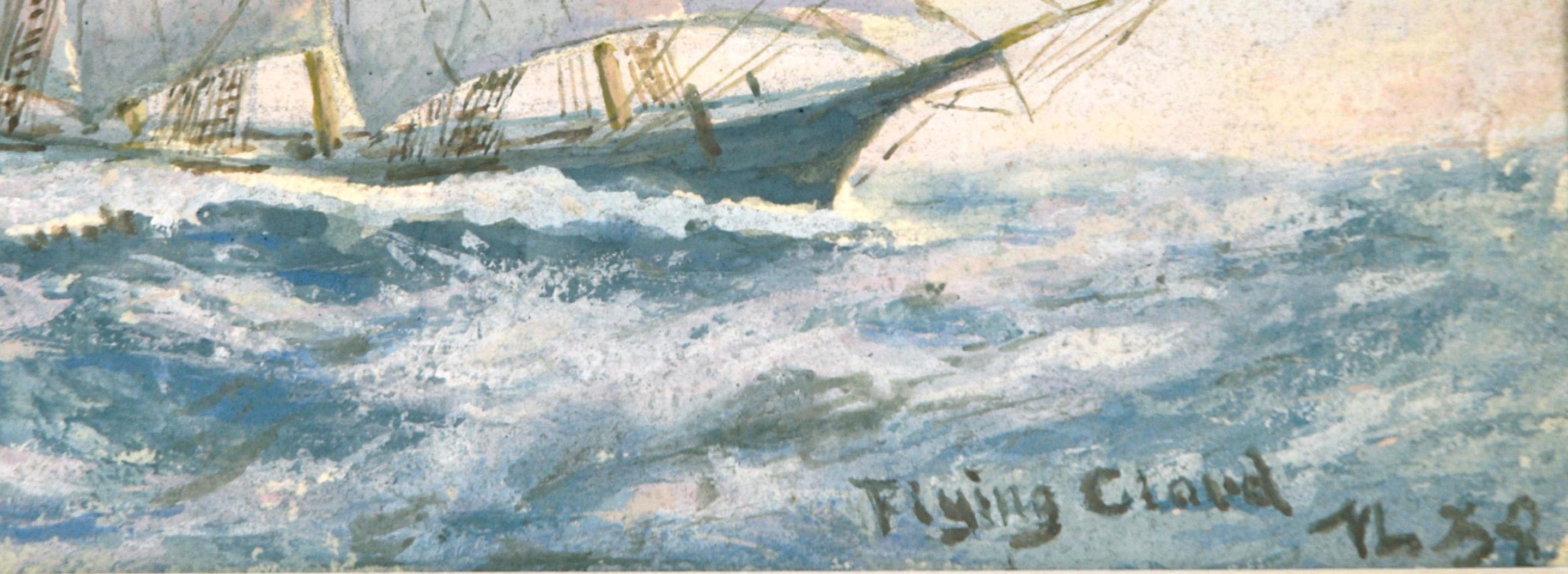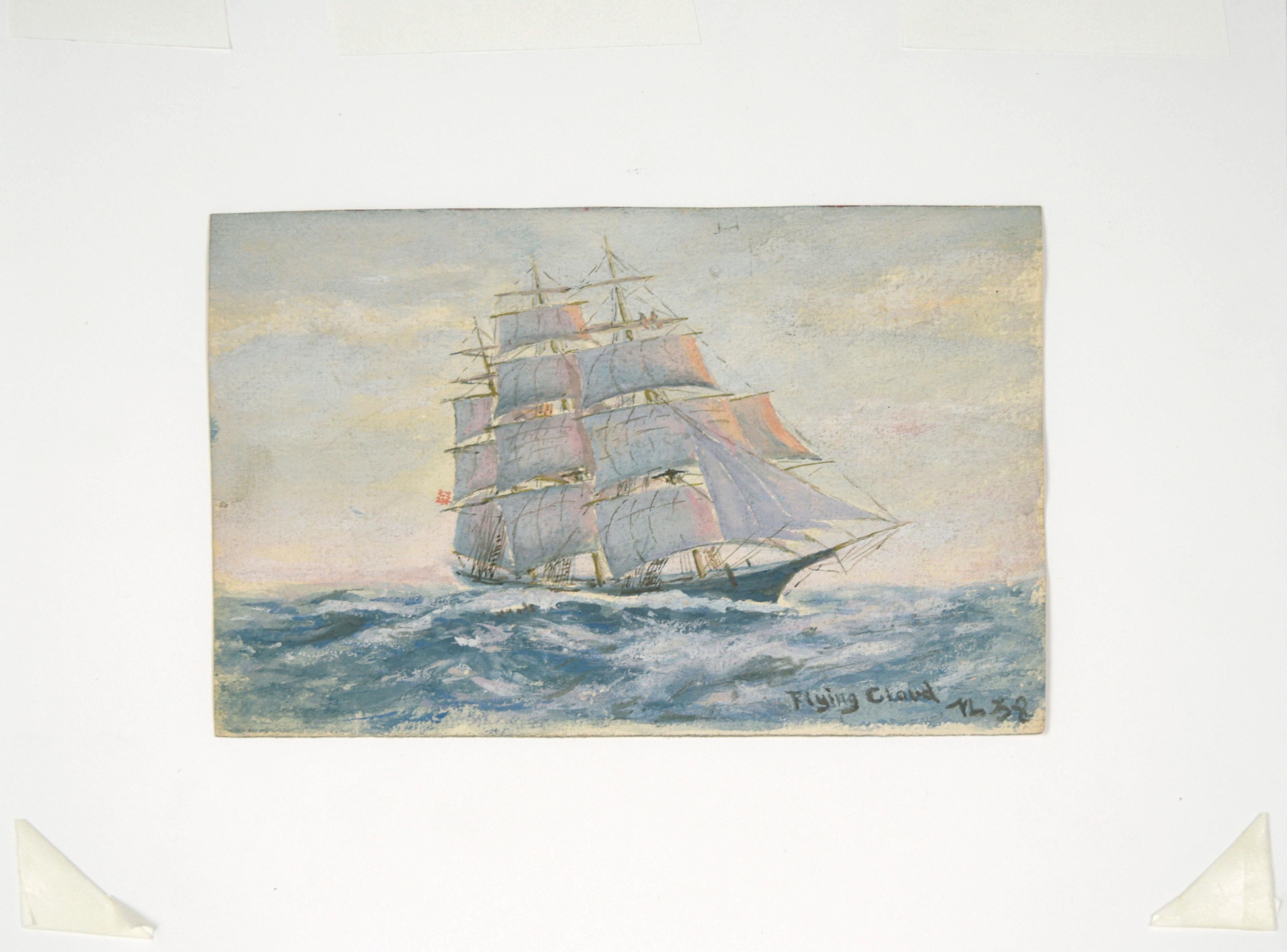 Questa piccola opera di Victor Lind (Svezia, XIX-XX secolo) raffigura il veliero Flying Cloud, che nel 1851 stabilì il record mondiale di passaggio più veloce da New York a San Francisco, completando la traversata in 89 giorni e 21 ore. La nave era famosa anche per avere un navigatore donna all'epoca, Eleanor Creesy. Nel 1854, la Flying Cloud effettuò nuovamente questo passaggio, battendo il loro record e stabilendo un nuovo tempo di 89 giorni e 8 ore. Questo record è stato superato solo nel 1989. In questo pezzo si vede la nave navigare in mare aperto. Il cielo ha un leggero tono caldo e le vele si tingono di rosa, catturando i raggi del tramonto o dell'alba. Il dipinto ha un tocco impressionistico, con pennellate visibili nelle onde e nella nave.