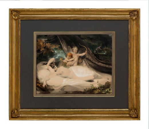 Un incantevole acquerello che raffigura una ragazza in piedi in un bosco e che indica il suo palmo aperto. L'opera è dipinta sulla base di un originale di Richard Westall RA (1785-18...