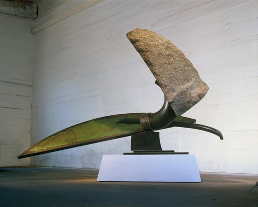 "Pointe (kyklos III)", scultura industriale e astratta in metallo e pietra