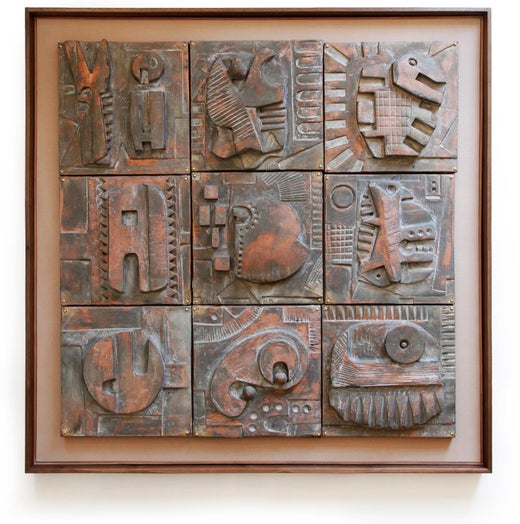 Mostra tuttoGrande pannello di 9 sculture originali moderniste in rilievo di Ron Hitchins