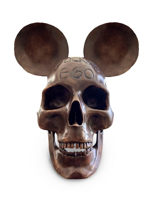Questa scultura in bronzo in edizione limitata (5 + 3 AP) è una dichiarazione rara e audace. La sua forma - un teschio meticolosamente dettagliato e ornato da orecchie sovradimensionate e immediatamente riconoscibili - crea un dialogo tra nostalgia, cultura del consumo e riflessione esistenziale. L'incisione "Fucking Ego" in cima al teschio aggiunge un elemento crudo e introspettivo, incoraggiando gli spettatori a interrogarsi sulla natura della presunzione nell'era digitale.