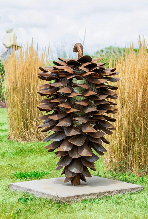 Questa scultura contemporanea da esterno di una pigna in acciaio è opera di Floyd Elzinga.