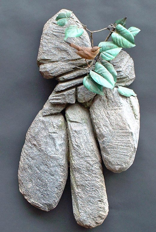 Scultura a parete di un gheppio a riposo su una scogliera rocciosa.