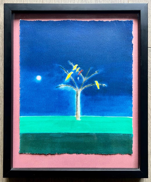 Questo dipinto, "Store Tree", presenta un paesaggio, ma con l'umorismo e l'ironia comuni all'opera di Robert Richter. Nell'immagine, un albero giallo brillante domina la composizione...