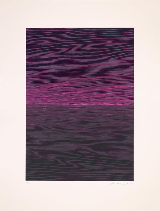 Crepe de Chine III è un paravento dai toni gioiello, caratterizzato da un terreno sereno e ondulato di linee fluide. Aspinwall lavora principalmente con mezzi di stampa perché le consentono di realizzare la qualità della linea e la saturazione del colore che sono essenziali per il suo lavoro. Sfrutta inoltre la capacità di ottenere impressioni multiple utilizzando la matrice più volte per stampare variazioni di colore della stessa composizione, restituendo impressioni di momenti diversi della giornata o della stagione.