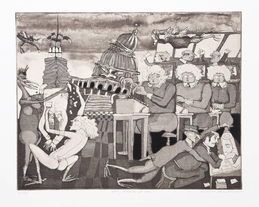 Warrington Colescott era un artista americano noto soprattutto per le sue acqueforti satiriche. Lavorando in quella zona che lui chiama "zona nera" tra la tragedia e l'alta commedia, dove con una piccola spinta in un senso o nell'altro si possono trasformare le urla in risate, Colescott ha esaminato la società di oggi, le sue virtù e le sue iniquità. Per rafforzare la satira, ha accostato umorismo e violenza, per rafforzare un commento su una situazione attuale, ha fatto uso di riferimenti storici.