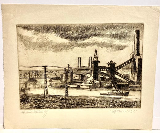 Earl Horter, Earl. PAESAGGIO URBANO DI NEW YORK. Acquaforte, non datata. Dimensioni dell'edizione non note. Stampato su carta pesante e firmato a matita. 6 1/2 x 6 1/8 pollici. In ot...