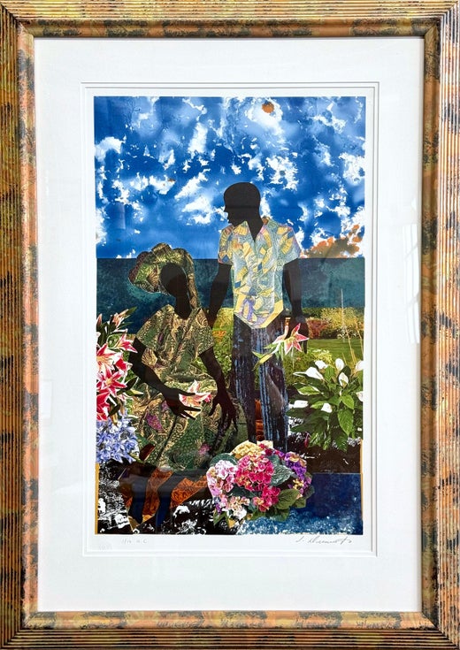 James DenmarkGARDEN ROMANCE Litografia firmata, coppia in nero, collage di ritratti di innamorati, fiori1996