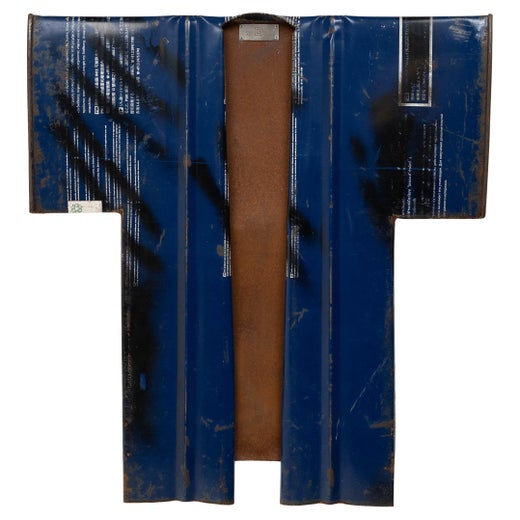 Appiattito con la parte centrale arrotolata, questo barile dismesso assume l'aspetto di un kimono tradizionale. Lavorato con cura, il metallo ammaccato diventa una lunghezza di seta drappeggiata, che si arriccia lungo le pieghe e si ripiega sul collo per formare un semplice colletto. Una piccola placca di metallo fissata al colletto rifinisce la scultura al posto dell'etichetta dell'indumento, con la firma dell'artista e la data di creazione.