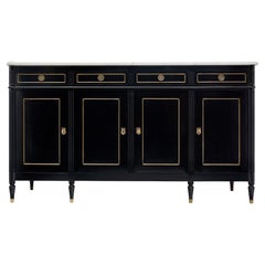 Buffet francese in stile Luigi XVI. Questo pezzo è realizzato in legno massiccio, principalmente mogano. È stato completamente ebanizzato e rifinito con una lucentezza francese. Ci s...