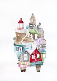 Quest'opera d'arte cattura un sereno paesaggio invernale con un gruppo di case pittoresche e colorate adagiate sul fianco di una montagna innevata. I vivaci colori pastello degli edi...