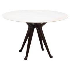 Un tavolo da pranzo rotondo e scultoreo, caratterizzato da un piano in legno massiccio e da una base conica rivestita in pregiata impiallacciatura di legno. La Silhouette è tranquill...