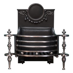 Un parafuoco realizzato da un fabbro con volute fluttuanti in ferro battuto in una cornice a pannelli con binari curvi in alto e in basso, con una rete in ferro intrecciata ai lati, ...