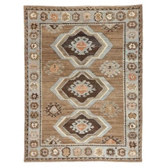 Questo tappeto in lana annodato a mano in stile Khotan è caratterizzato da un campo marrone caldo, completato con eleganza da sottili accenti di oro, rosa, beige e blu. Il suo design...