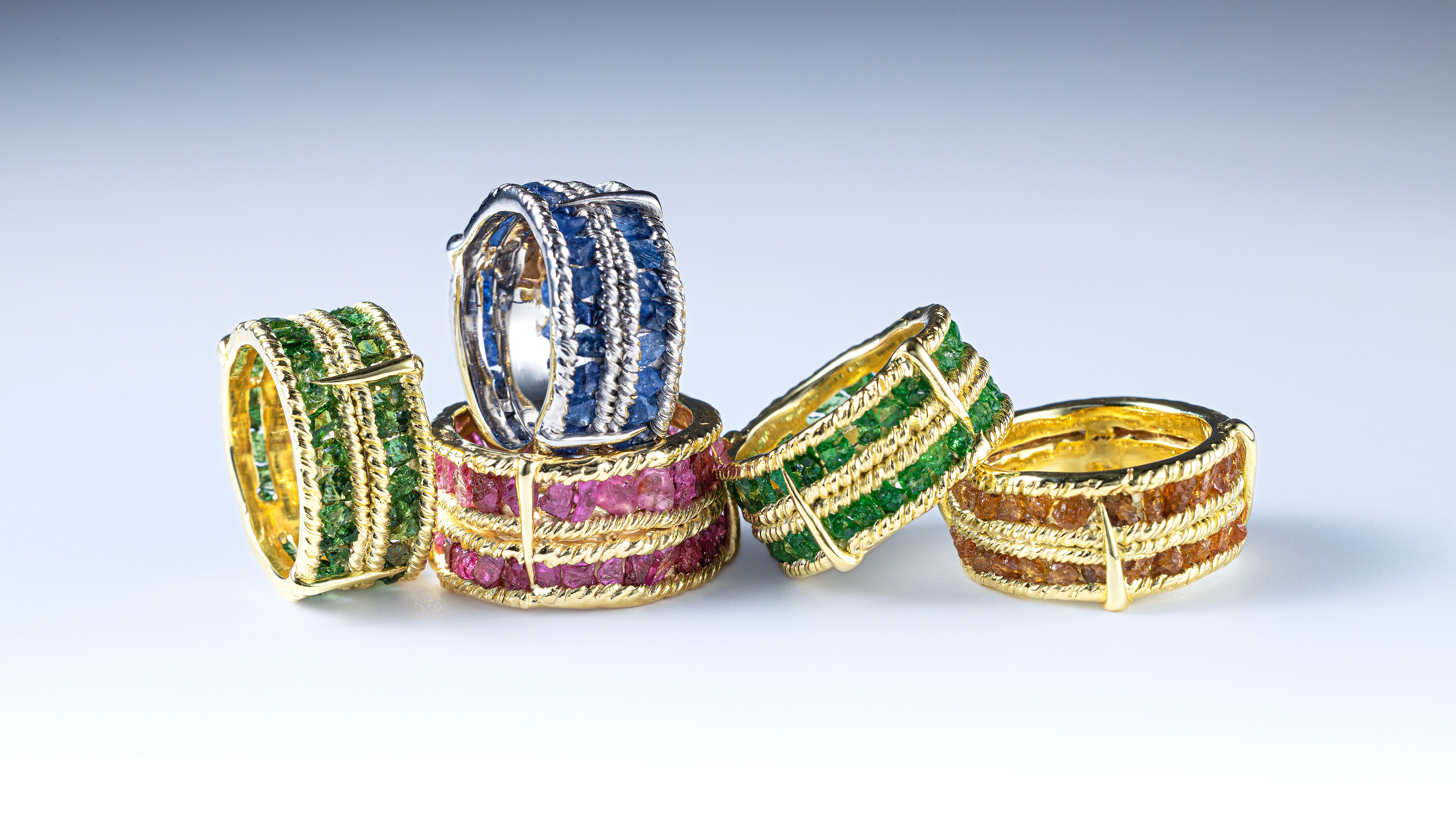 German Kabirski developed his own way of setting raw gemstones that he calls the “stained glass ” method. Instead of cutting the stones to fit traditional mounts, he builds thin metal frames around each natural edge and surface — similar to how pieces of glass are held in stained glass windows. This allows the gemstone to stay raw and untouched while still being securely held in place. The light can move through the stone’s natural struc