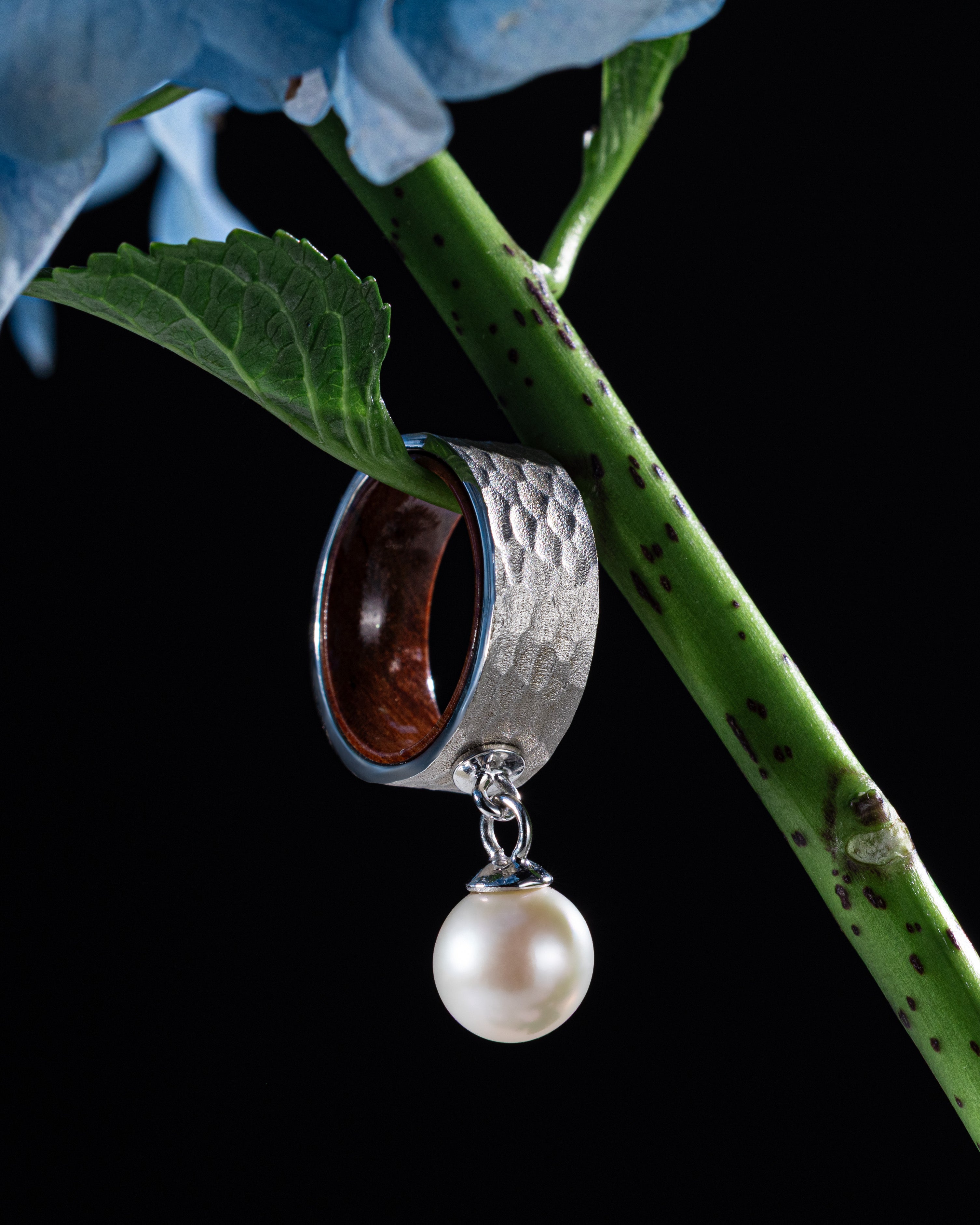 Elemental Jewelry: each ring blends three essentials—rosewood inner band, sterling silver, and a natural gemstone charm in motion.