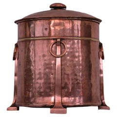 Un grande calderone di rame o contenitore per tronchi con bordo arrotolato su lati dritti sopra una base delicatamente curva con centro piatto, con due manici ad anello in ottone riv...