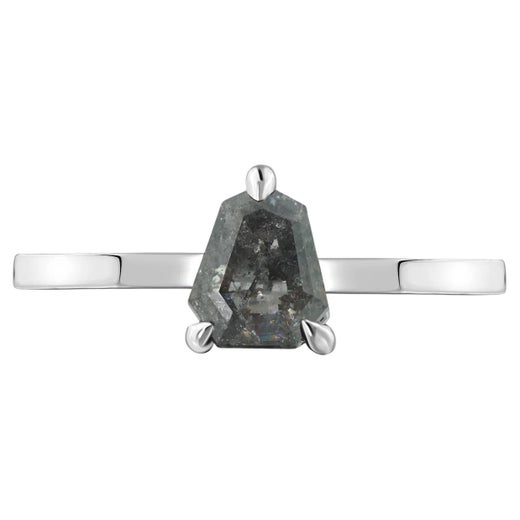 Questo diamante trilione da 1,78 carati con taglio sale e pepe ha una qualità mercuriale. In alcune luci, appare come un grigio tempestoso e profondo; in altre, si sposta verso il ne...