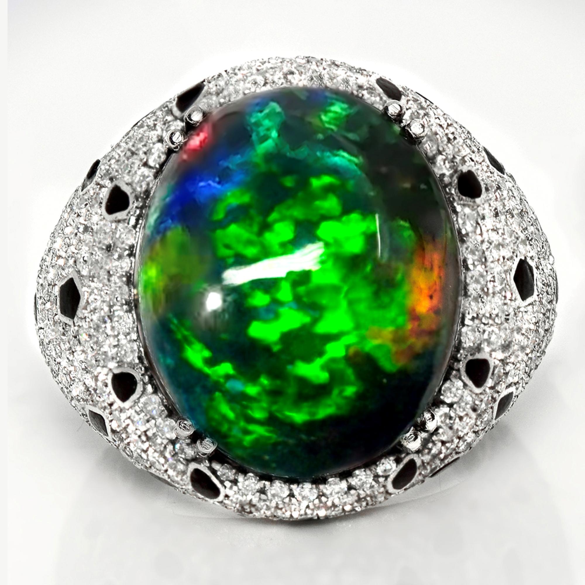 Questo anello presenta un Opale nero naturale da 14.92 carati con un effetto di gioco di colori. Sulla fascia in oro bianco 14K sono incastonati diamanti naturali F-G, VS per un peso di 2,78 carati e smalto nero.