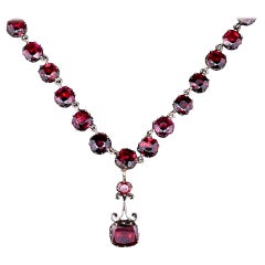 Una bellissima collana georgiana con una serie di granati rodoliti graduati incastonati in oro rosa e collegati da piccoli anelli tondi. Dal granato centrale pende un pendente stacca...