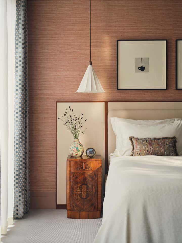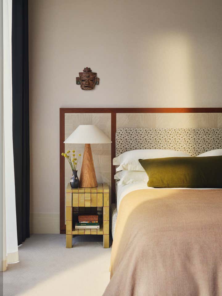 Elicyon’s meticulous layering of unique antique pieces, including original Art Deco walnut side tables and a checkered oak cabinet in the guest bedroom, alongside a bold pair of reupholstered powder blue ground-hugging armchairs in the principal bedroom, creates a gallery-like atmosphere. Building on this aesthetic, statement vintage pieces such as a 1936 maple wood grand piano and a 300kg 19th century marble urn, not only pay homage to the site’s heritage but also serve as striking focal points, anchoring the apartment’s design in history and craftsmanship. An Art Deco scalloped dressing table chair from Marylebone Antiques, a bespoke shelving unit crafted by Rochford Joinery, and olive-green glazed tile bedside cabinets by British ceramicist Matthew Raw, further reinforce the apartment’s Art Deco feel.