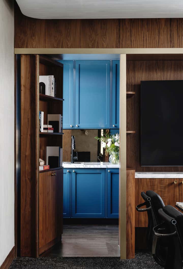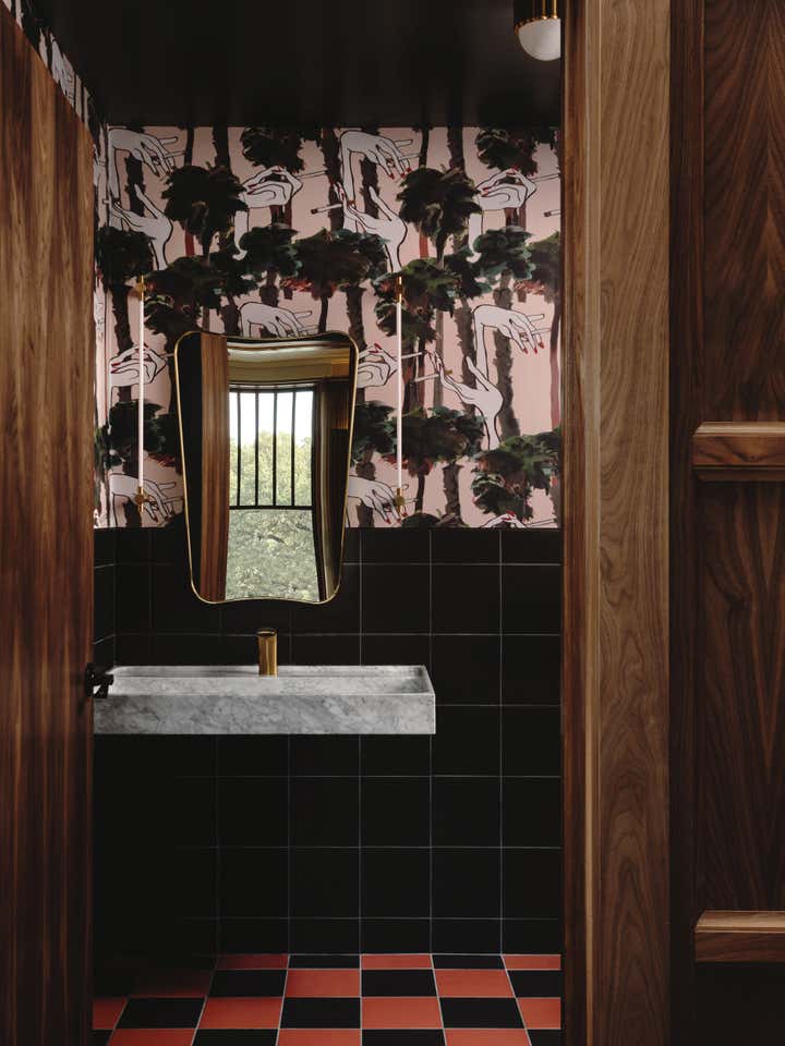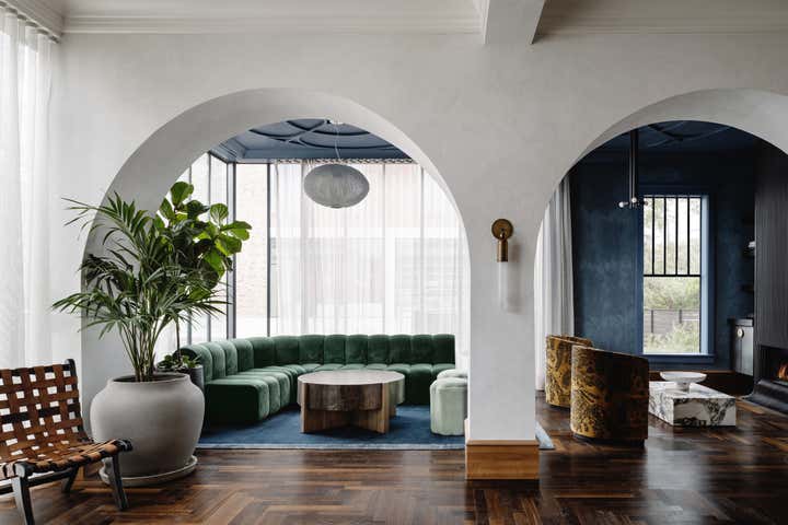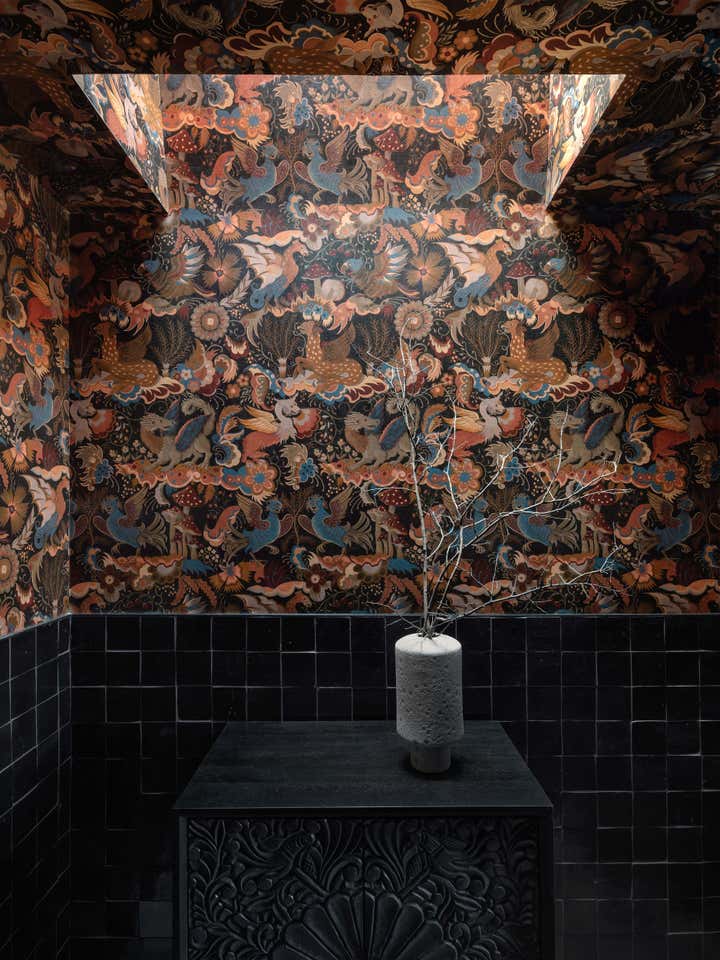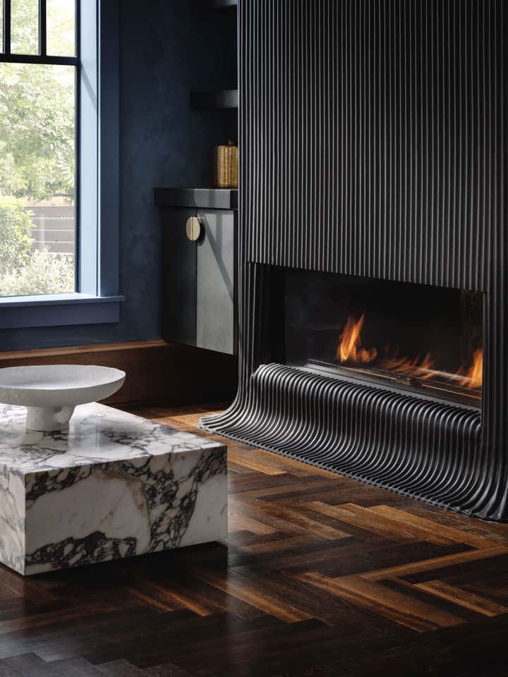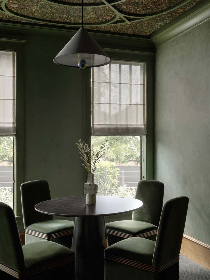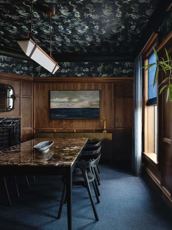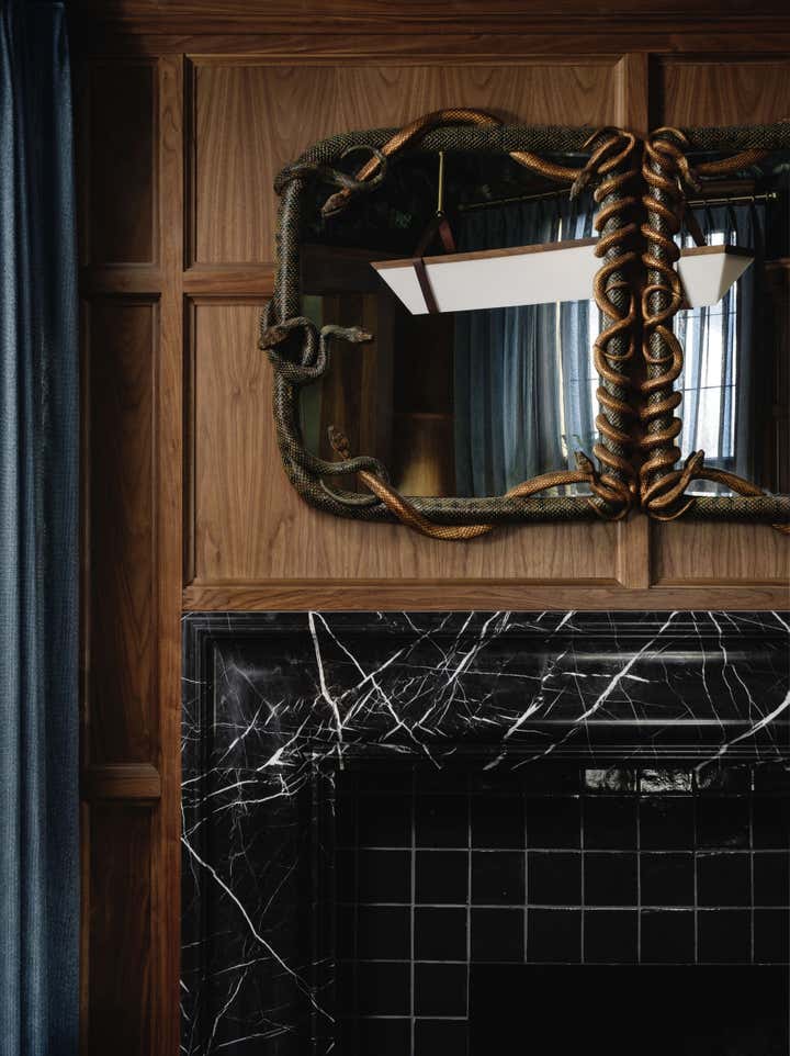 The layout took cues from the existing chimneys to create new hearth moments and leaned into dark, warm tones to create a rich and cozy interior. The sophisticated study-like atmosphere is achieved through careful selection of materials and color-mapped palettes. The furnishings, a mix of vintage and modern pieces with luxe fabrics and textures, create a sense of intimacy.