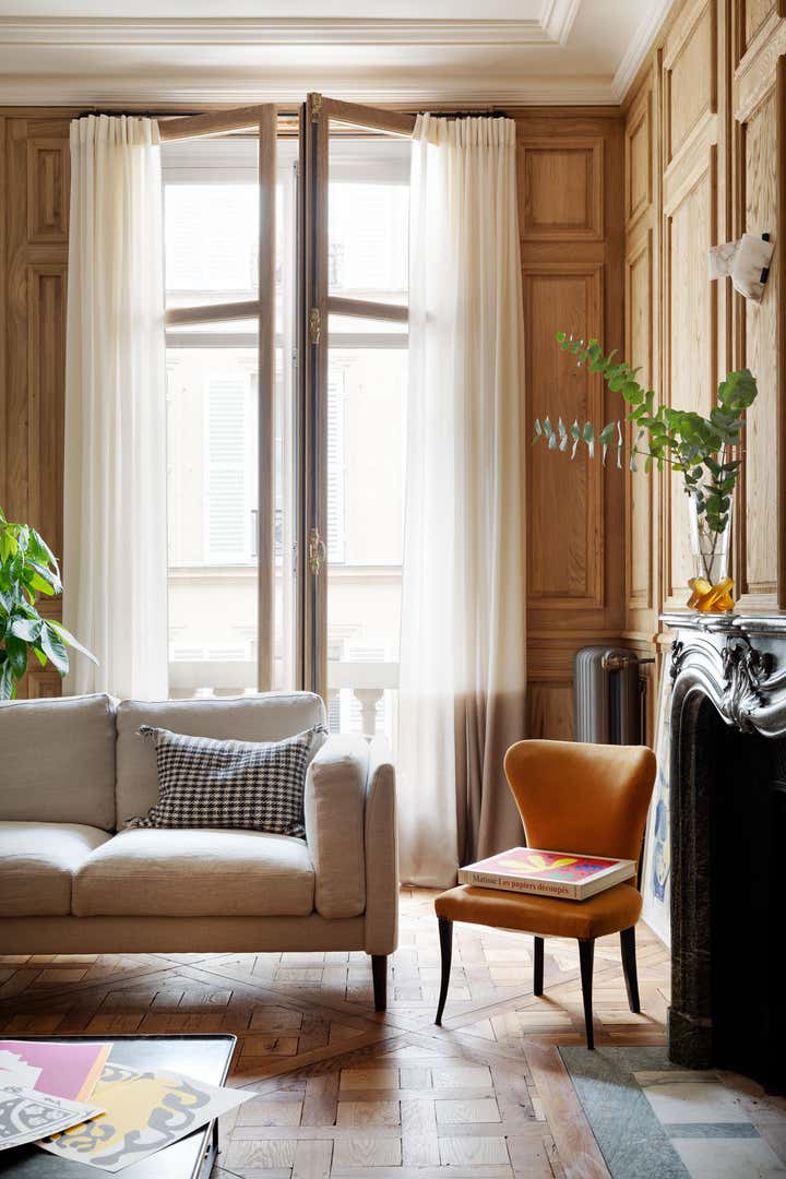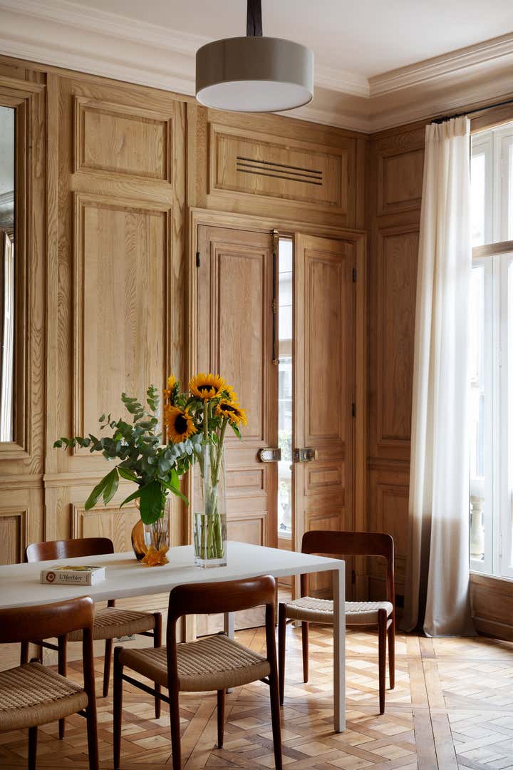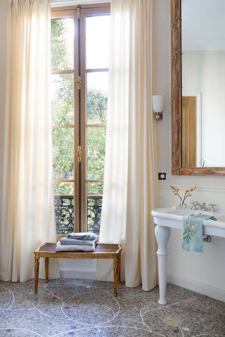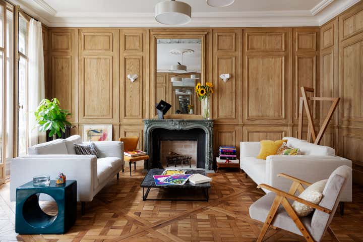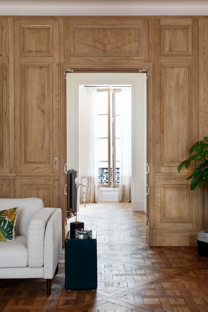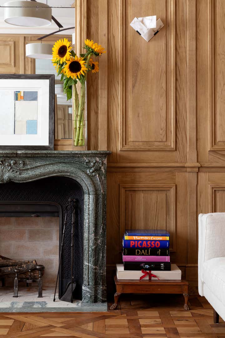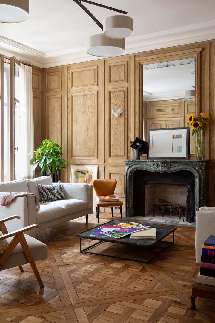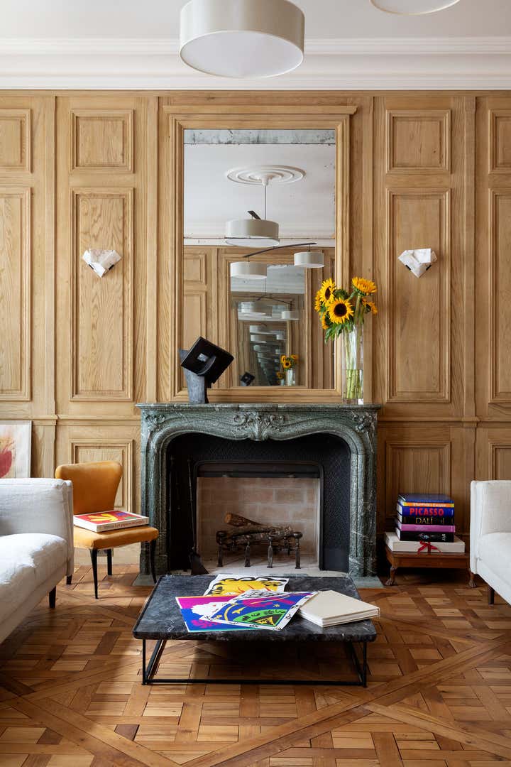 We restored this apartment in a classical style with wood paneling, which brings instant warmth, wood panels, moldings in the original style, an antique fireplace, and a parquet Versailles wood floor. It is no accident that we then chose eclectic furniture, mixing antique pieces with new and vintage pieces from the big names of Italian design, to contrast with the traditional renovation and make the space more playful and better suited for 21st-century living. In the bathroom, we collaborated with an artist to create a custom mosaic whose motif is inspired by the fig tree in the courtyard.