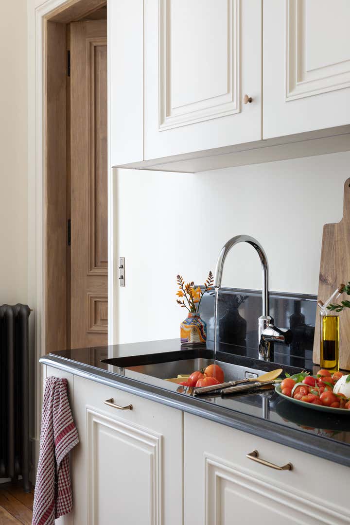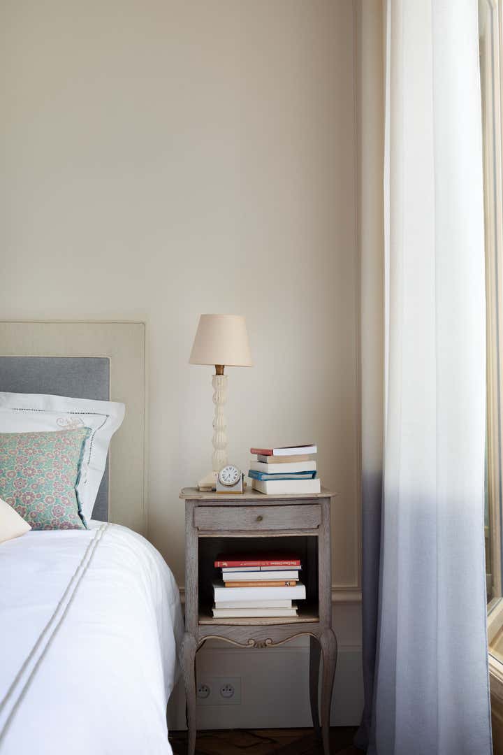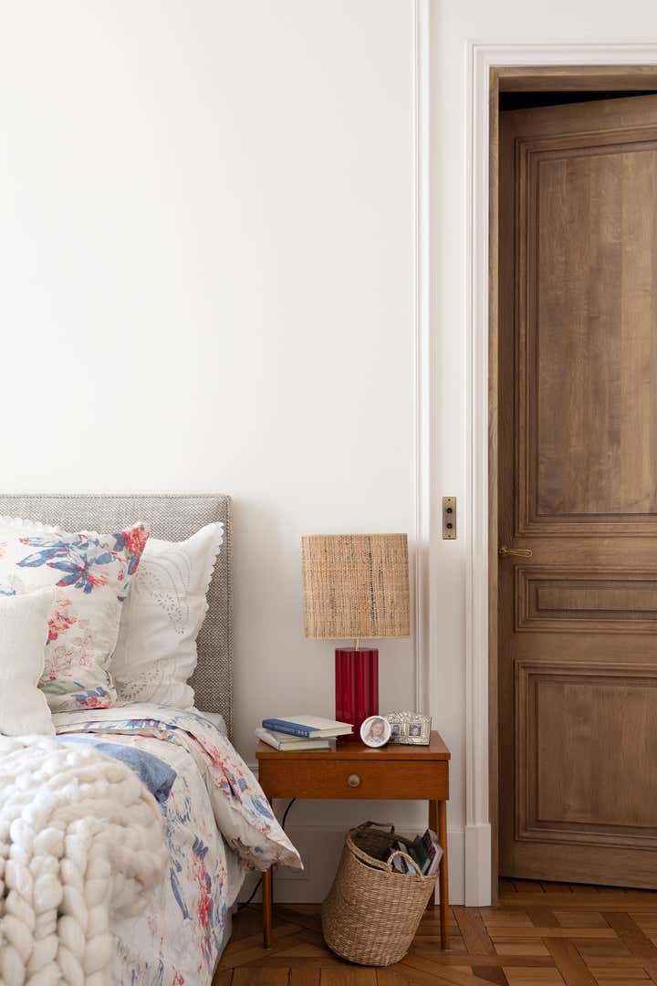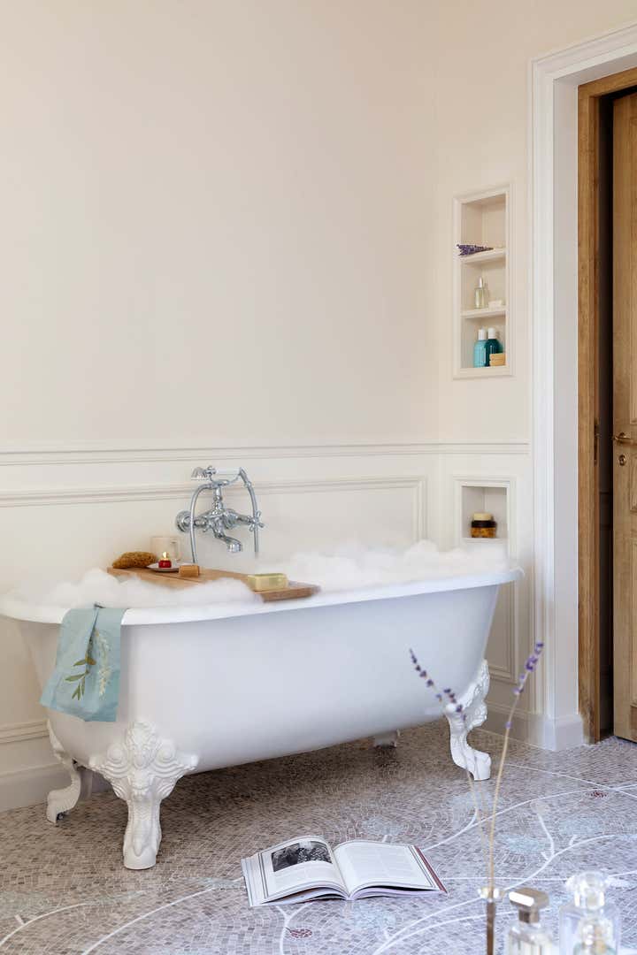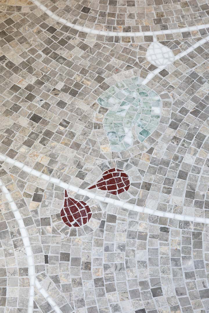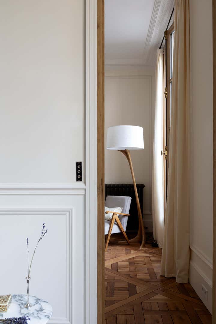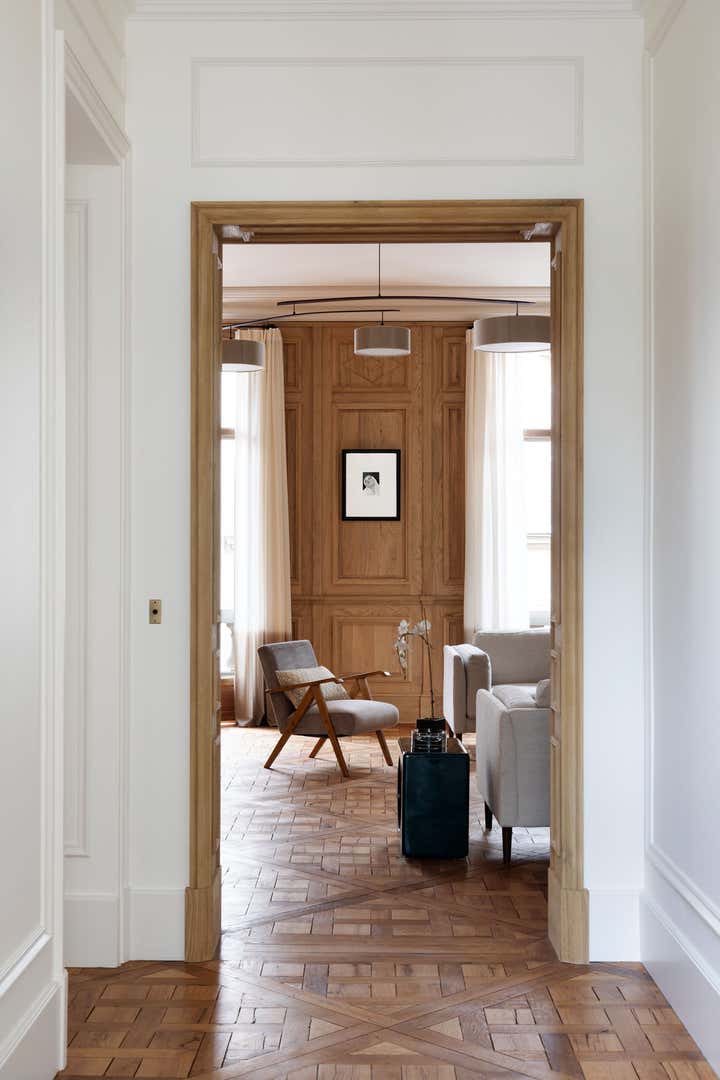 We restored this apartment in a classical style with wood paneling, which brings instant warmth, wood panels, moldings in the original style, an antique fireplace, and a parquet Versailles wood floor. It is no accident that we then chose eclectic furniture, mixing antique pieces with new and vintage pieces from the big names of Italian design, to contrast with the traditional renovation and make the space more playful and better suited for 21st-century living. In the bathroom, we collaborated with an artist to create a custom mosaic whose motif is inspired by the fig tree in the courtyard.