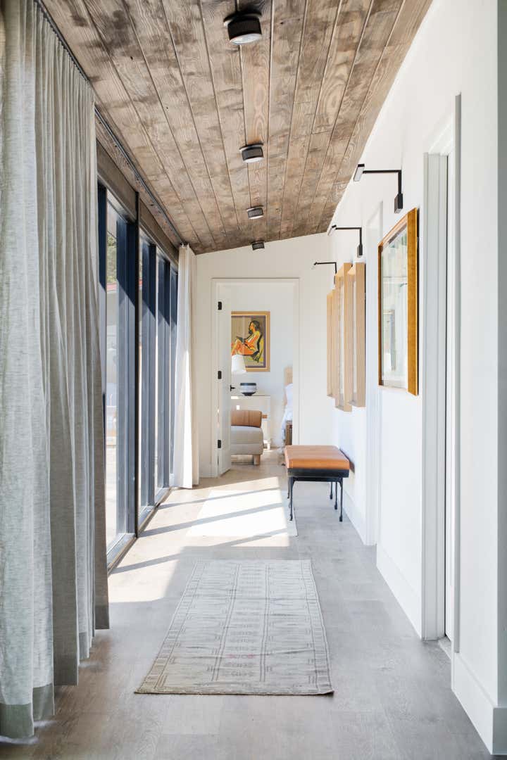We completed a full re-design of the former 2 bedroom/2 bath main house + 2 bedroom/1 bath guest house into a 3/3 main house + 2/2 guest house in the existing 2,800 sf footprint of the former space. Original midcentury details were preserved and new details were added to complement the architecture, such as the gallery hall with planked ceiling and glass walls and appropriate kitchen and bath space planning and finish selections. Each bedroom was outfitted with 2 queen beds to enhance the cabin feel and layered furnishings were utilized throughout to create a comfortably warm ambience unique to this acreage property.