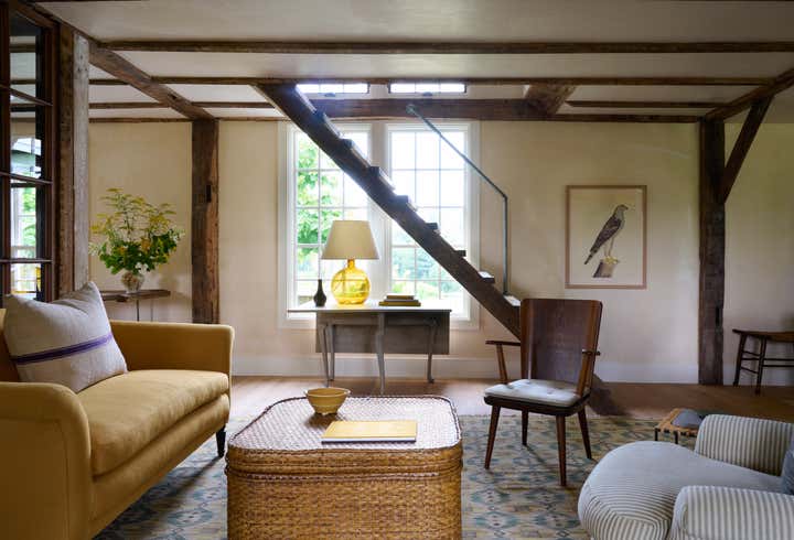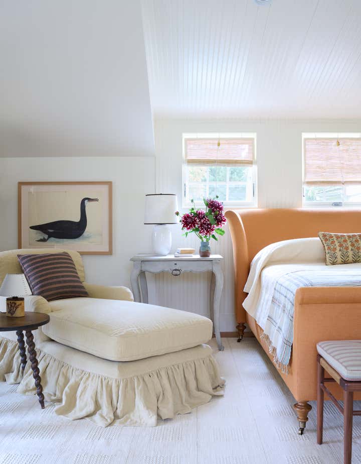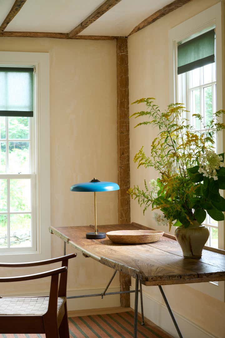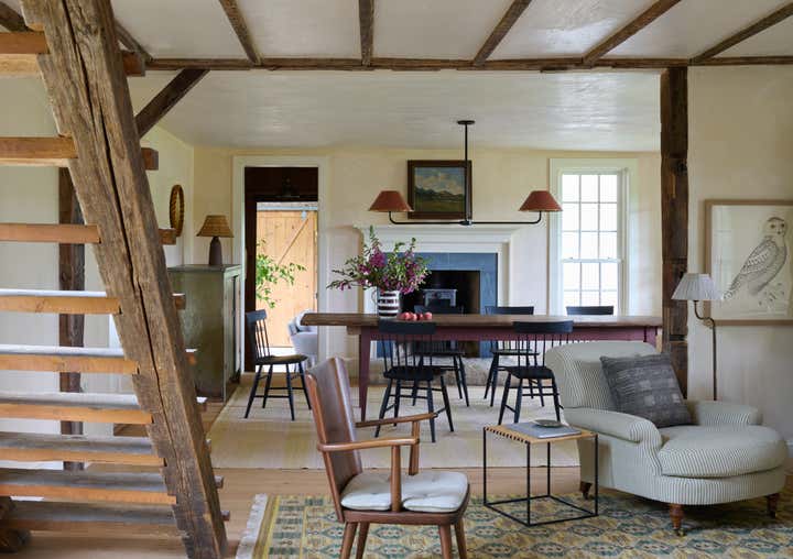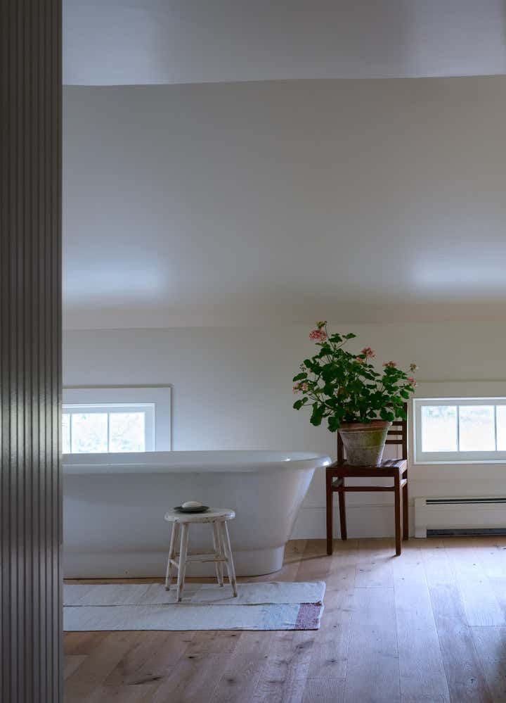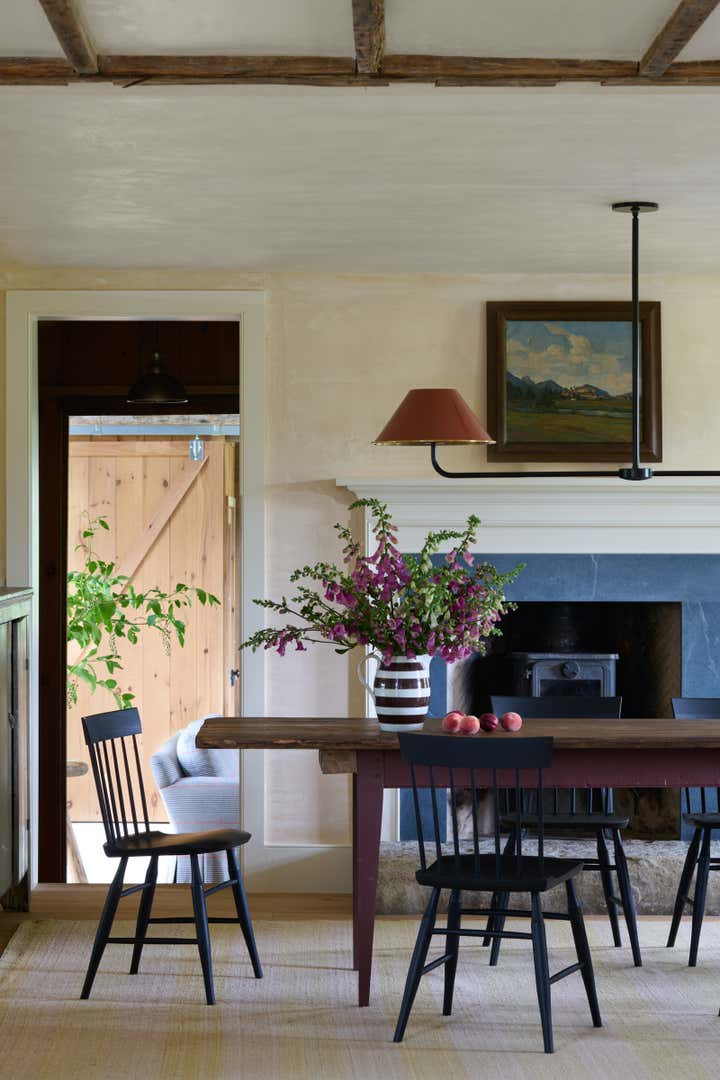 Built in 1764 as a farmstead, this house had about 2,000 square feet of space originally. In 2006, the previous owners added a 1,000-square-foot wing which now houses a great room with a cozy reading nook and a small guest room on the second floor. While the project began without renovation plans, an unexpected flood from a burst pipe caused enough damage to warrant replacing the floors and renovating the kitchen and primary bathroom. To bring light and patina to the walls in the main living areas, we hired a local plaster specialist to concoct the perfect shade of pale peach. The furniture pieces throughout were acquired from all over, though there was a focus on Scandinavian pieces, both antique and vintage. The textiles and rugs were designed to feel laid back, collected, and perhaps, like they had always been there.