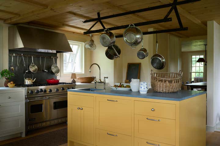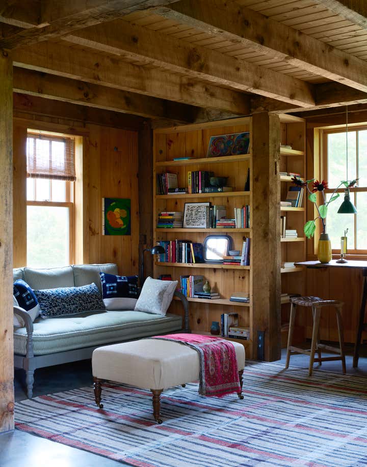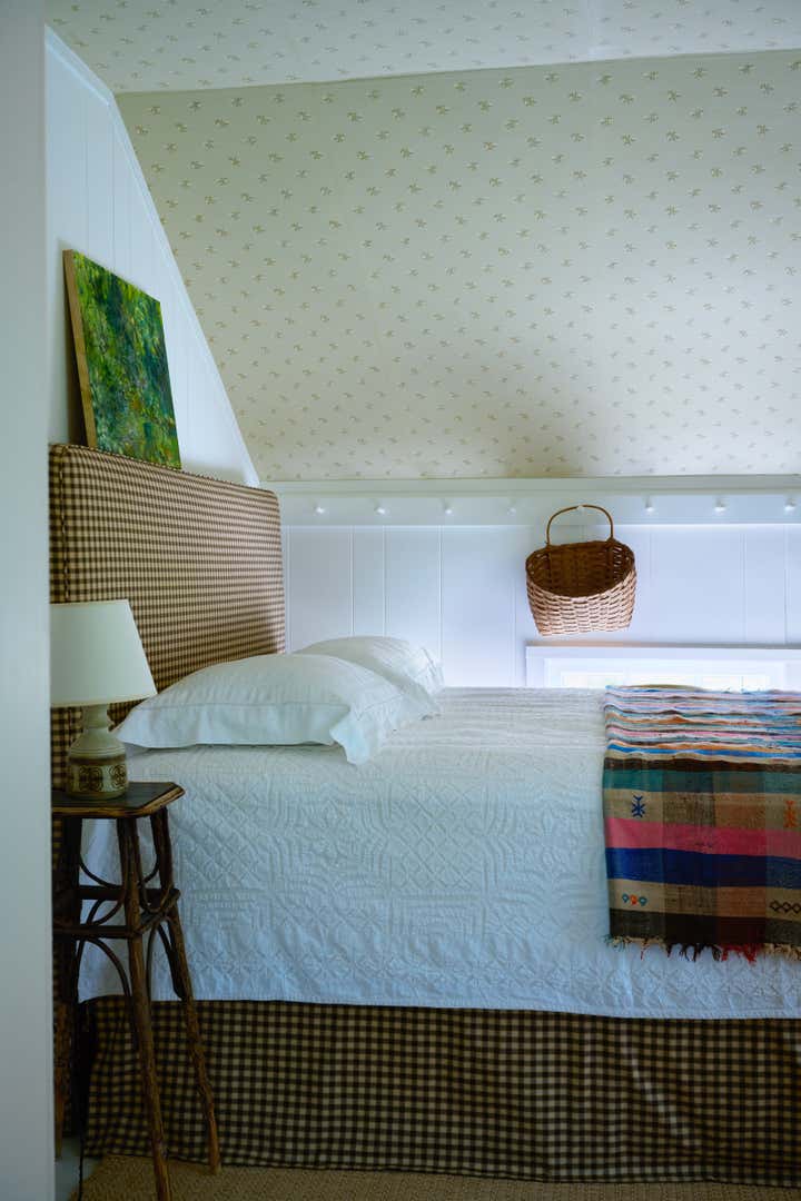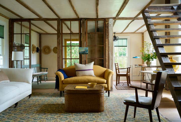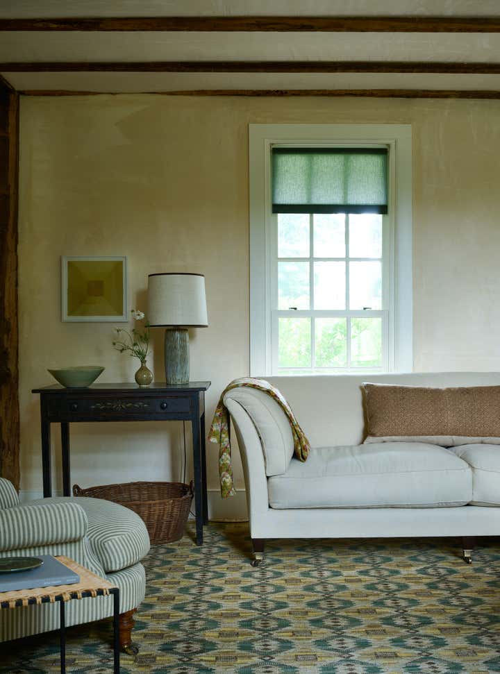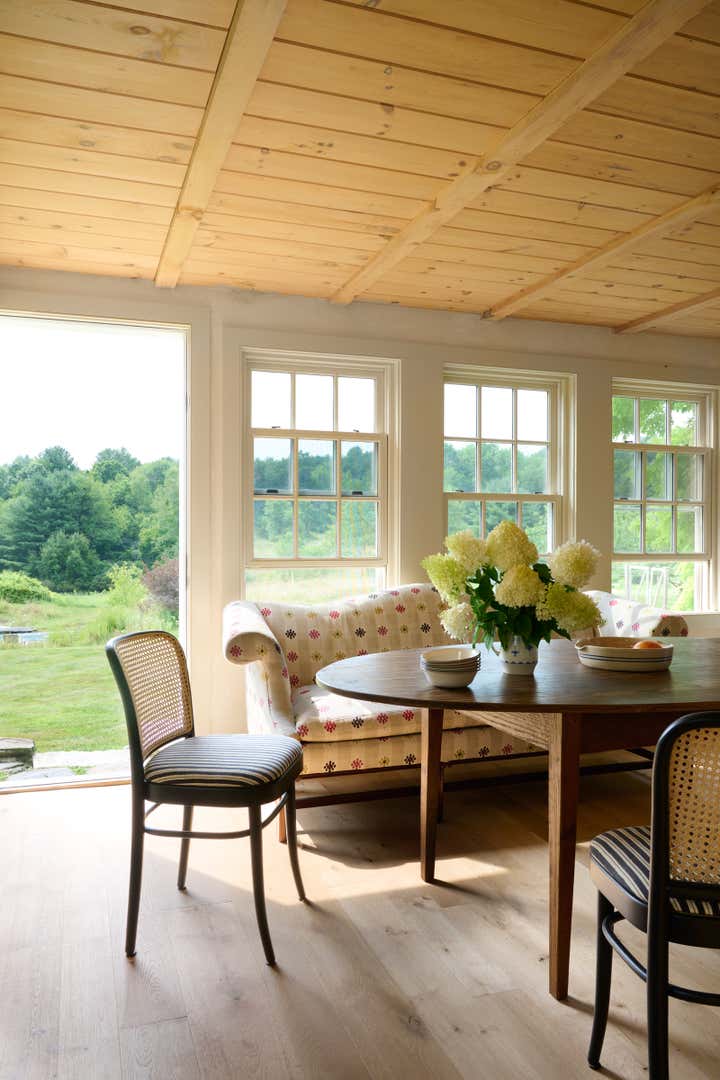 Built in 1764 as a farmstead, this house had about 2,000 square feet of space originally. In 2006, the previous owners added a 1,000-square-foot wing which now houses a great room with a cozy reading nook and a small guest room on the second floor. While the project began without renovation plans, an unexpected flood from a burst pipe caused enough damage to warrant replacing the floors and renovating the kitchen and primary bathroom. To bring light and patina to the walls in the main living areas, we hired a local plaster specialist to concoct the perfect shade of pale peach. The furniture pieces throughout were acquired from all over, though there was a focus on Scandinavian pieces, both antique and vintage. The textiles and rugs were designed to feel laid back, collected, and perhaps, like they had always been there.