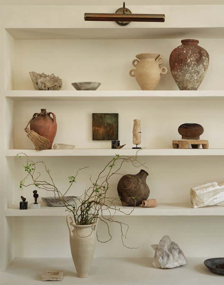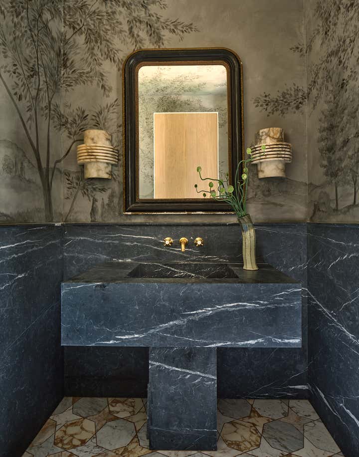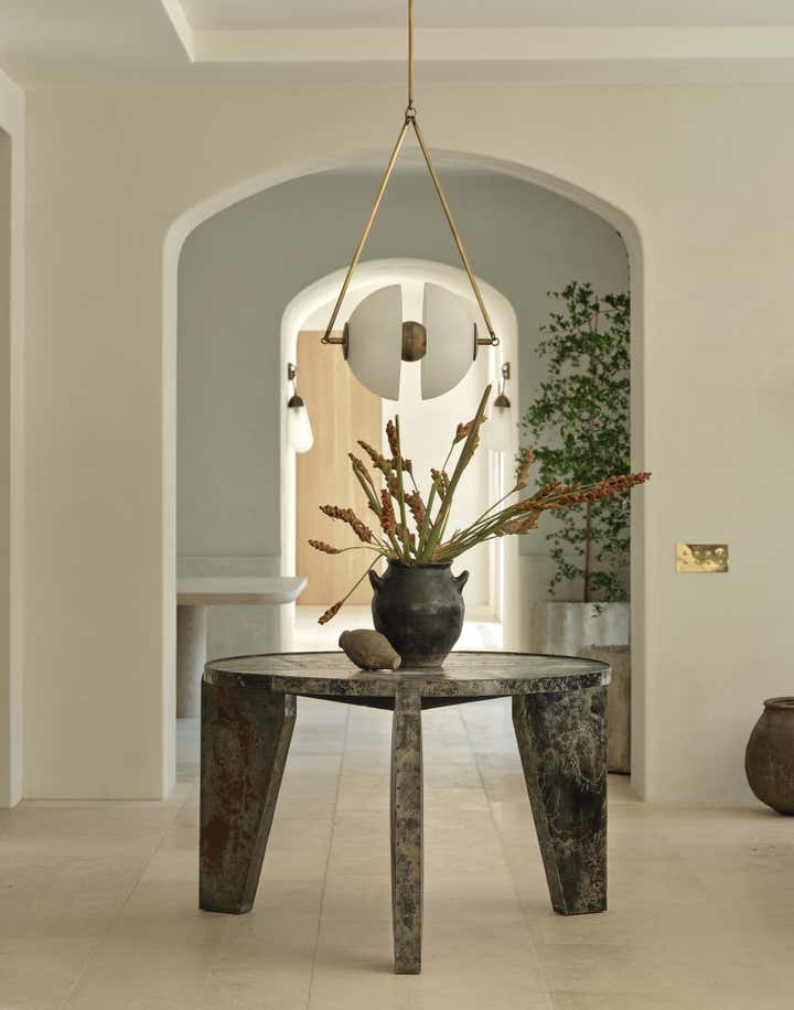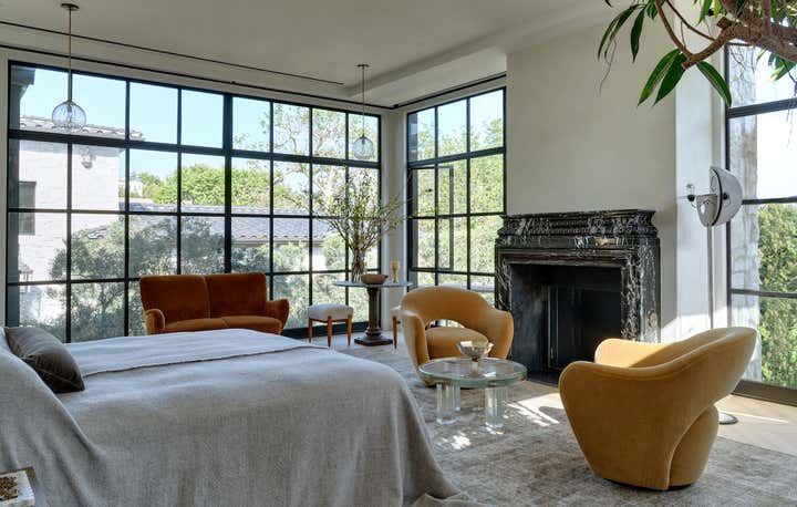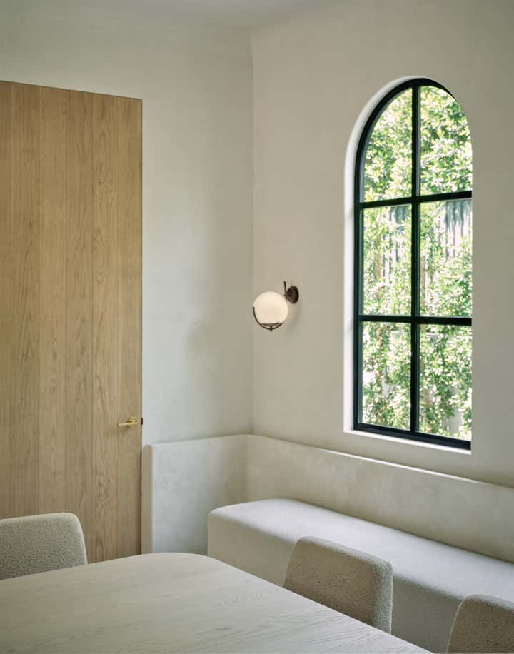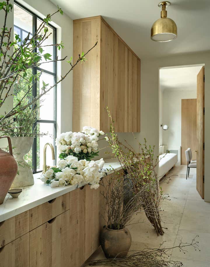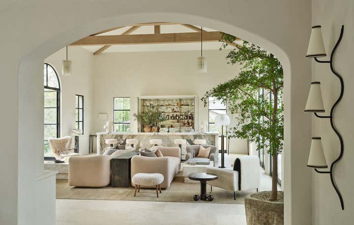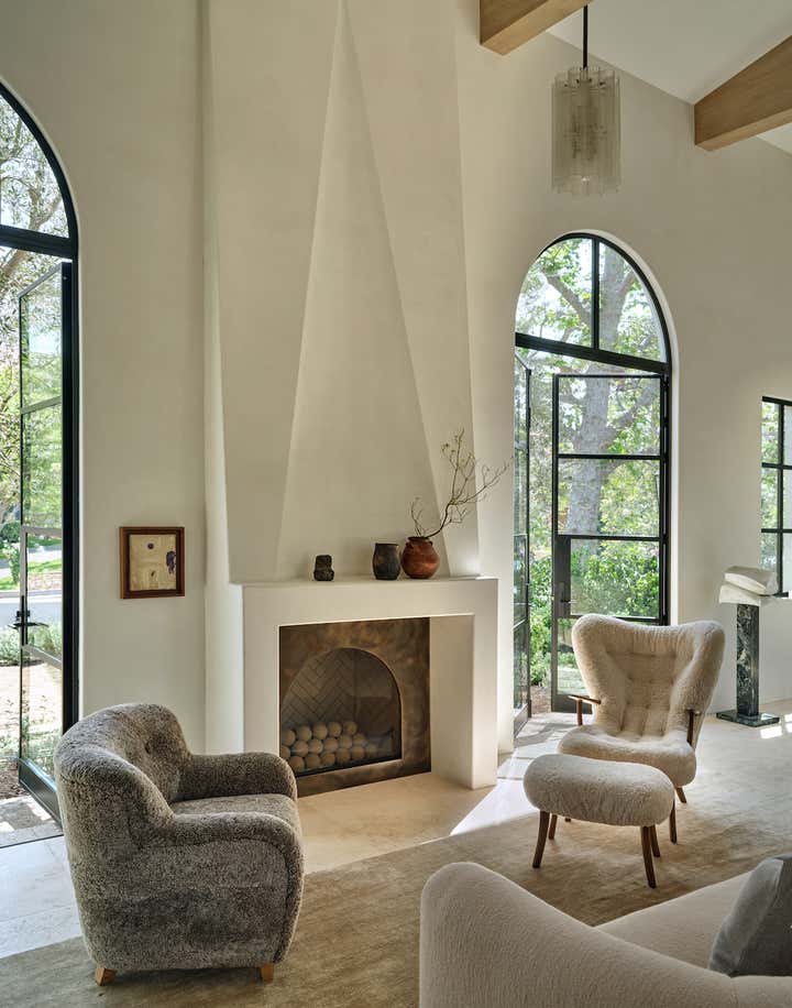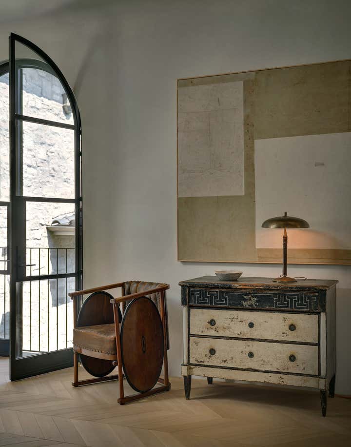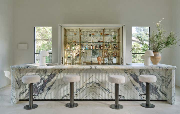 When it came to the interior design of the house, the Daneshes discovered another design crush in Jeremiah Brent, the AD100 designer whose luxuriously low-key modern aesthetic and unapologetic affection for soothing beiges, chalky whites, and grays intersected perfectly with theirs. “Jeremiah understood exactly what we wanted, but he also managed to push us out of our comfort zone,” says Kevin, who credits the designer for talking him into installing the antique black marble fireplace mantel in the primary bedroom (“It came out of a château in France, which at first sounded crazy to me”) and opening his mind to the beauty of vintage lighting (like the rare midcentury floor lamp by Italian architect Luigi Caccia Dominioni that elegantly punctuates a seating area in the living room, which he admits originally “made him nervous”). For Brent, no aspect proved too small, too large, or too infuriating. He designed the elegant bronze snake handles adorning the bar’s cabinetry but also wrestled with the contractors for weeks to get the house’s exterior bricks cut, washed, and rewashed to achieve the perfect impression of centuries-old weathering.