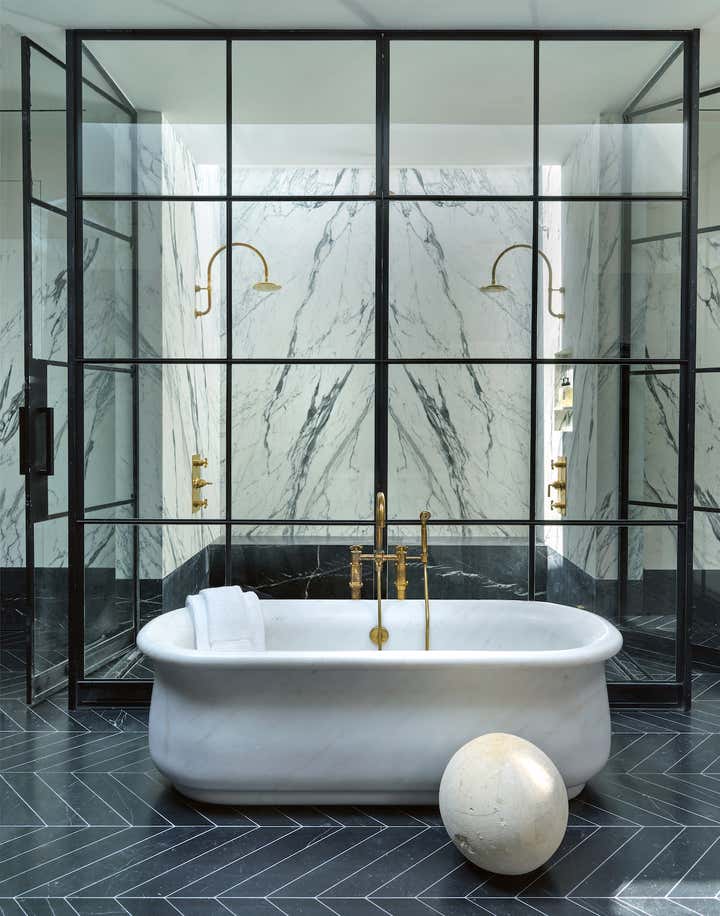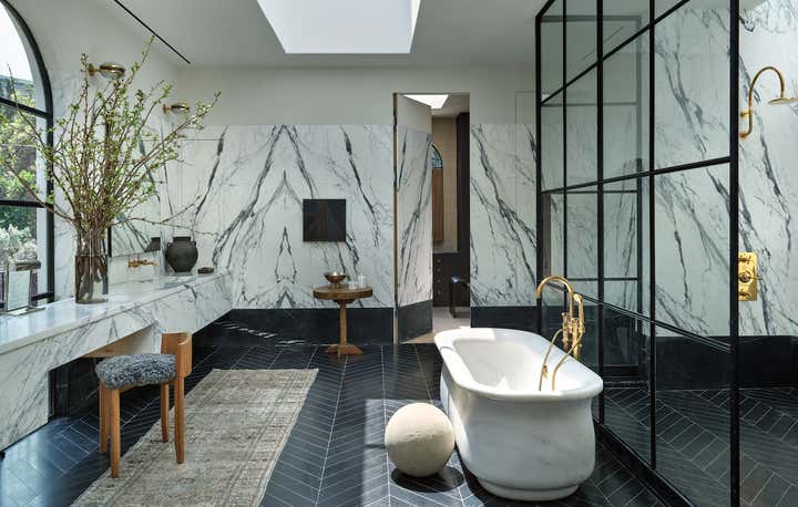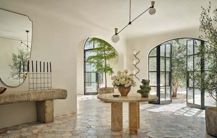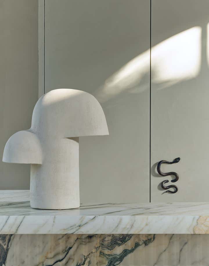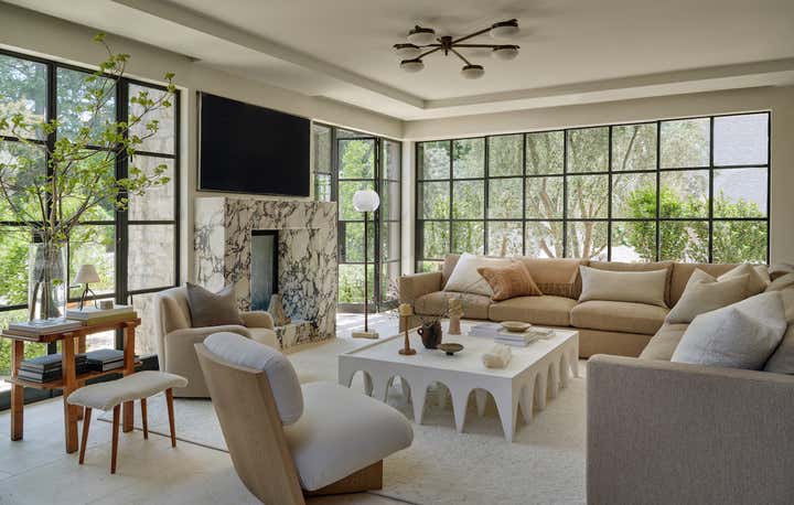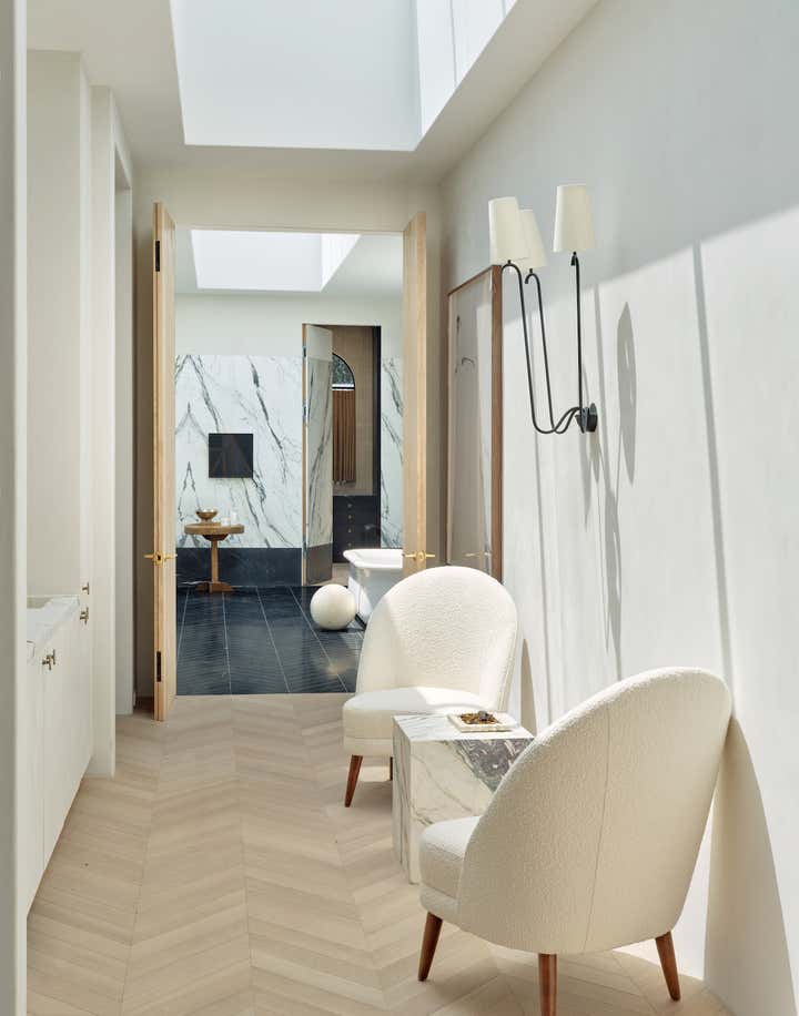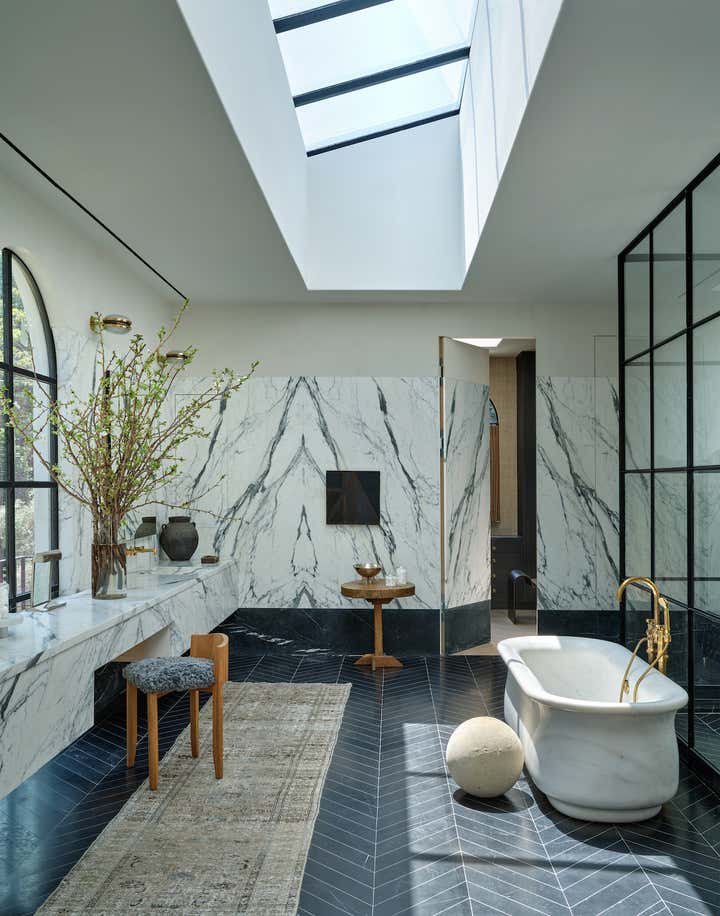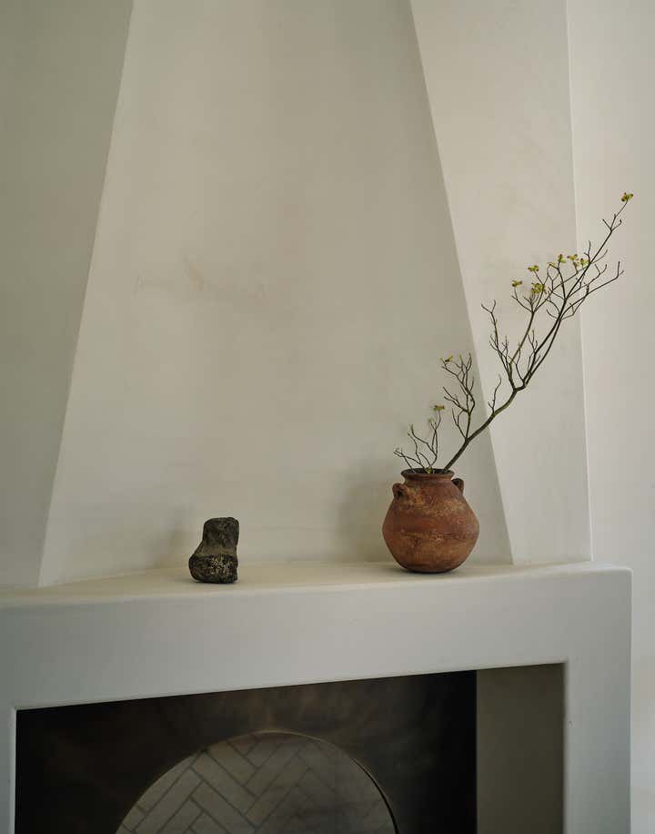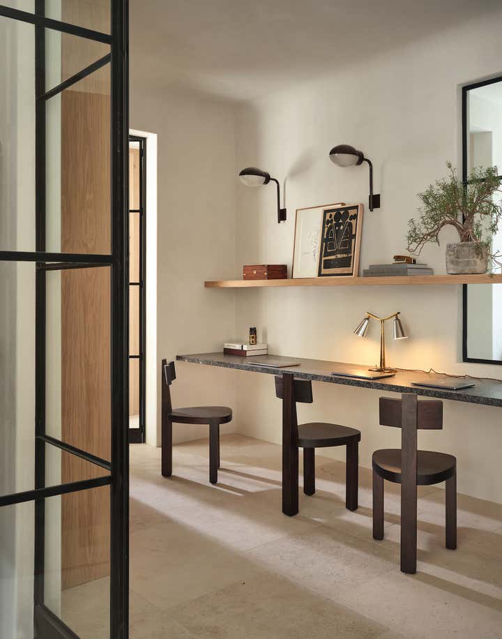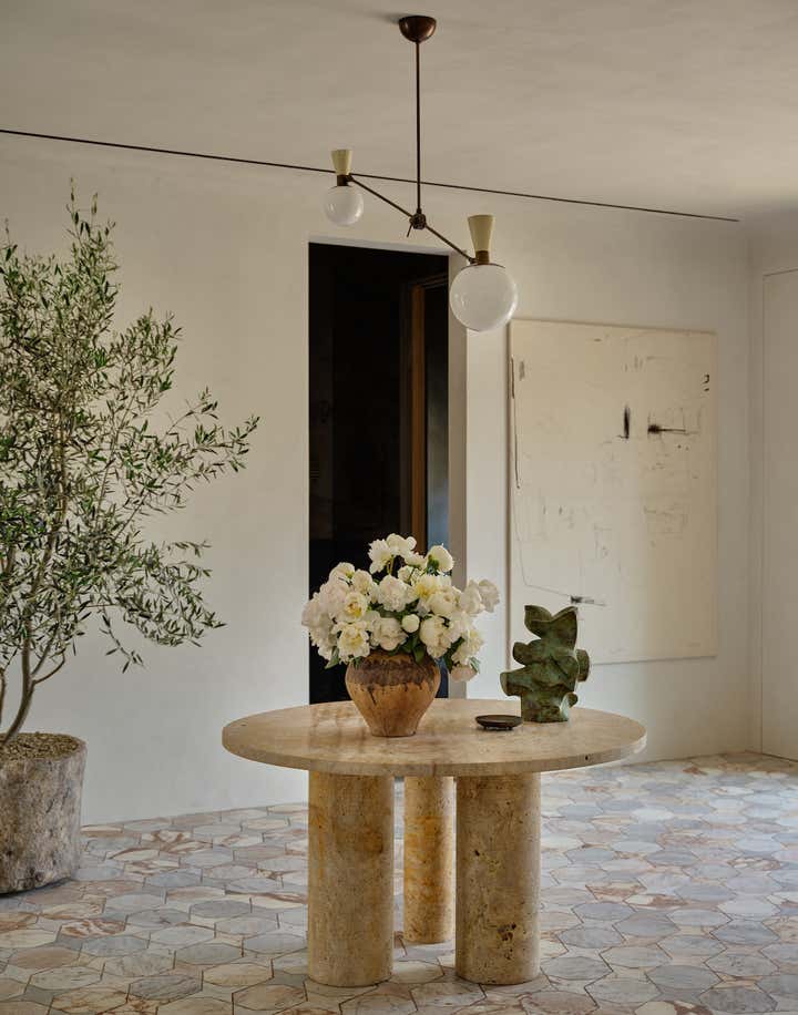 When it came to the interior design of the house, the Daneshes discovered another design crush in Jeremiah Brent, the AD100 designer whose luxuriously low-key modern aesthetic and unapologetic affection for soothing beiges, chalky whites, and grays intersected perfectly with theirs. “Jeremiah understood exactly what we wanted, but he also managed to push us out of our comfort zone,” says Kevin, who credits the designer for talking him into installing the antique black marble fireplace mantel in the primary bedroom (“It came out of a château in France, which at first sounded crazy to me”) and opening his mind to the beauty of vintage lighting (like the rare midcentury floor lamp by Italian architect Luigi Caccia Dominioni that elegantly punctuates a seating area in the living room, which he admits originally “made him nervous”). For Brent, no aspect proved too small, too large, or too infuriating. He designed the elegant bronze snake handles adorning the bar’s cabinetry but also wrestled with the contractors for weeks to get the house’s exterior bricks cut, washed, and rewashed to achieve the perfect impression of centuries-old weathering.