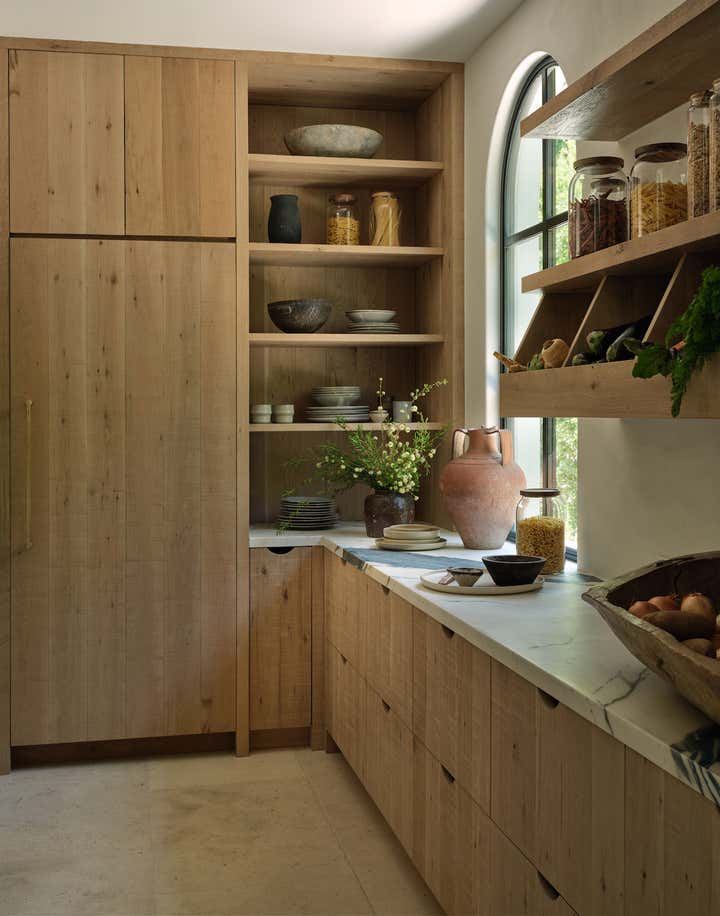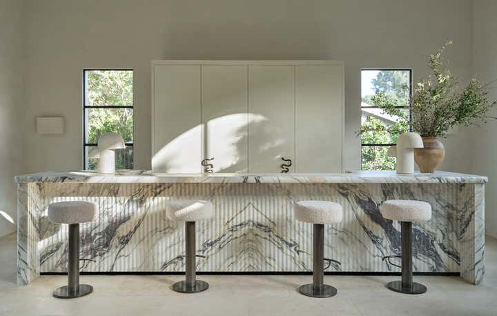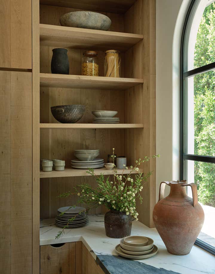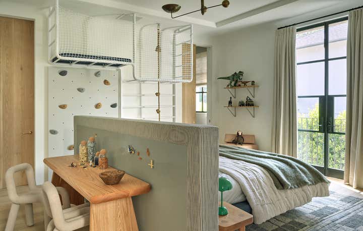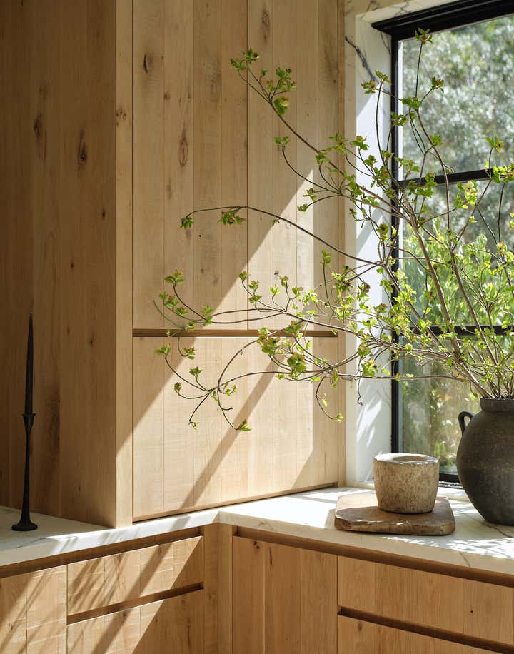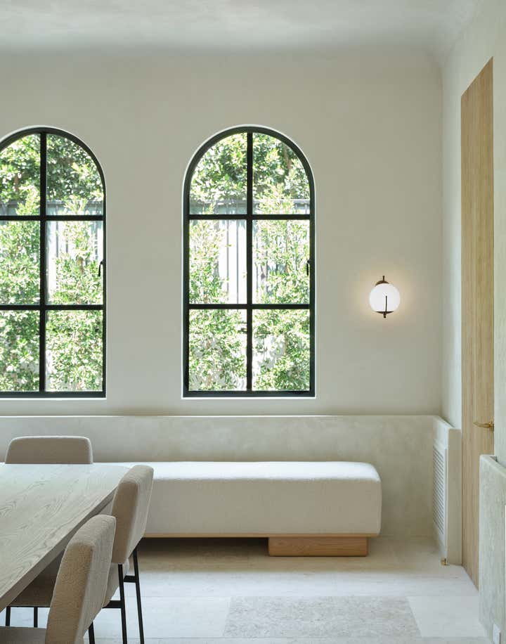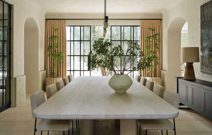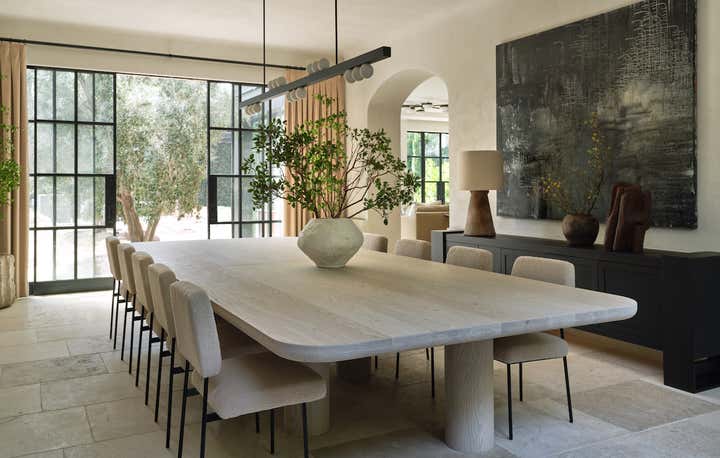 He also brought to life what might be the best-used dining room in the neighborhood. Here, around a custom white oak table that comfortably seats 16, the family hosts a lively Shabbat dinner for their parents, siblings, in-laws, nieces, and nephews (all of whom are based in LA) once a month. When the dinners run to 20 guests or more (a not uncommon event), tray tables are brought out and the sleek upholstered banquette is put into service. “Kevin and Nahal may have rebelled against their parents’ decorating style, but the truth is, everything they’ve done here is with their extended family in mind,” says Brent. “Every decision they made was rooted in comfort and personalization.” In other words, it’s a house built on love and tradition—even if there are no Persian carpets in sight.