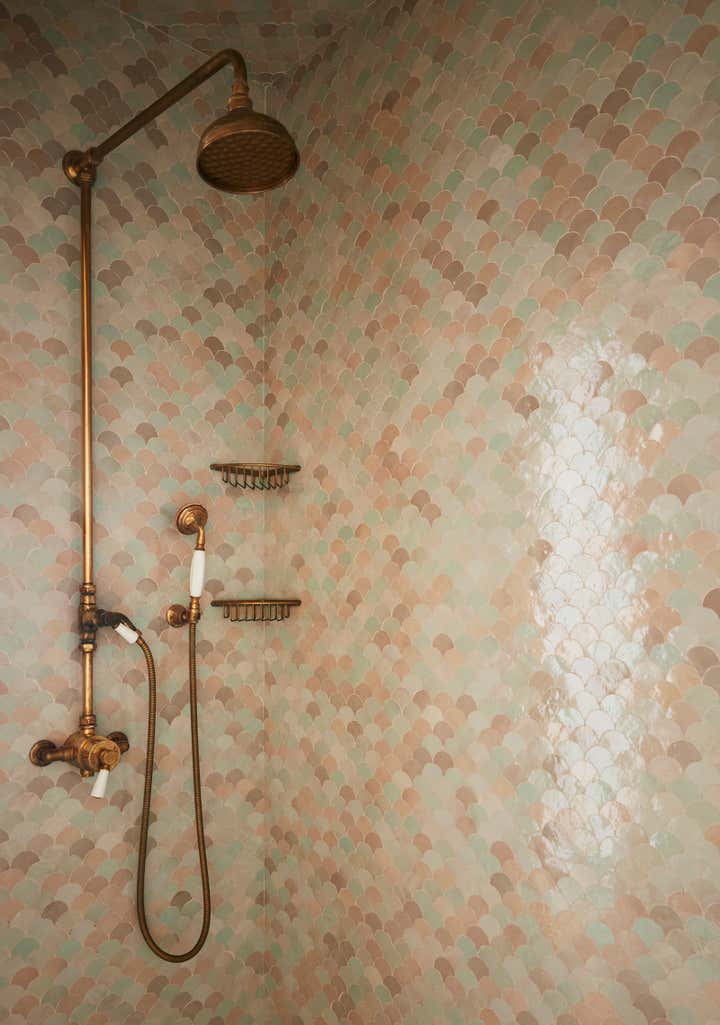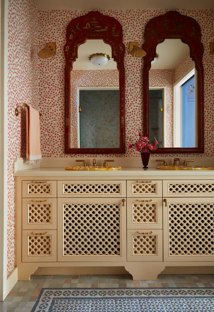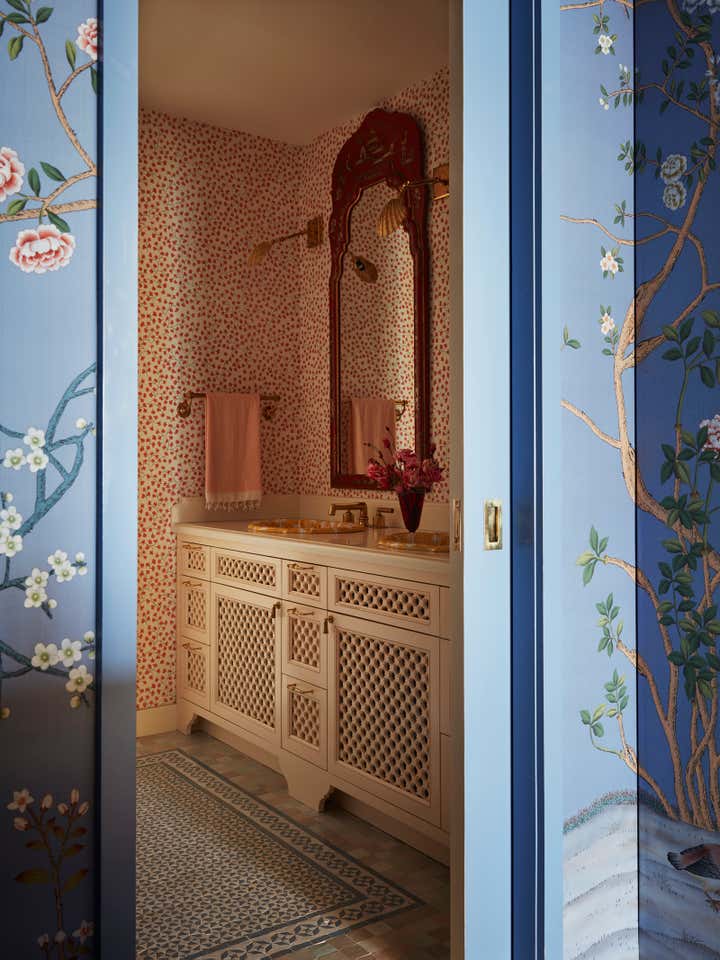 The interior design journey began with the primary bedroom suite, where we crafted a dreamy dressing room and bathroom to cater to our client’s desires for a space that exuded opulence. We sourced a custom-designed, hand-carved, leather-lined cabinet to house precious accessories amongst a vintage Venetian glass flower basket light and an antique Kazak rug. The primary bathroom emerged as a work of art, with a generous shower adorned with handcrafted scalloped Zellige mosaic tiles and a square field of mosaic floor tiles and decorative inlay. A pair of oversized Chinoiserie mirrors hung above the mosharabi-paneled double vanity with scalloped sinks, harmonizing perfectly with the golden yellow hue that is woven through the entire project.