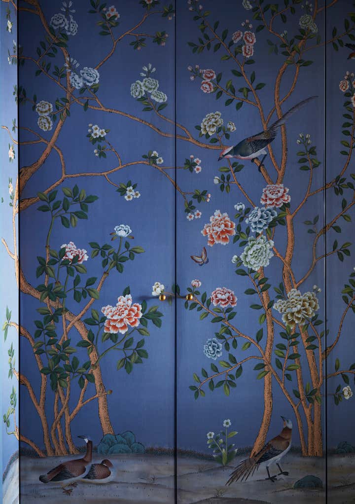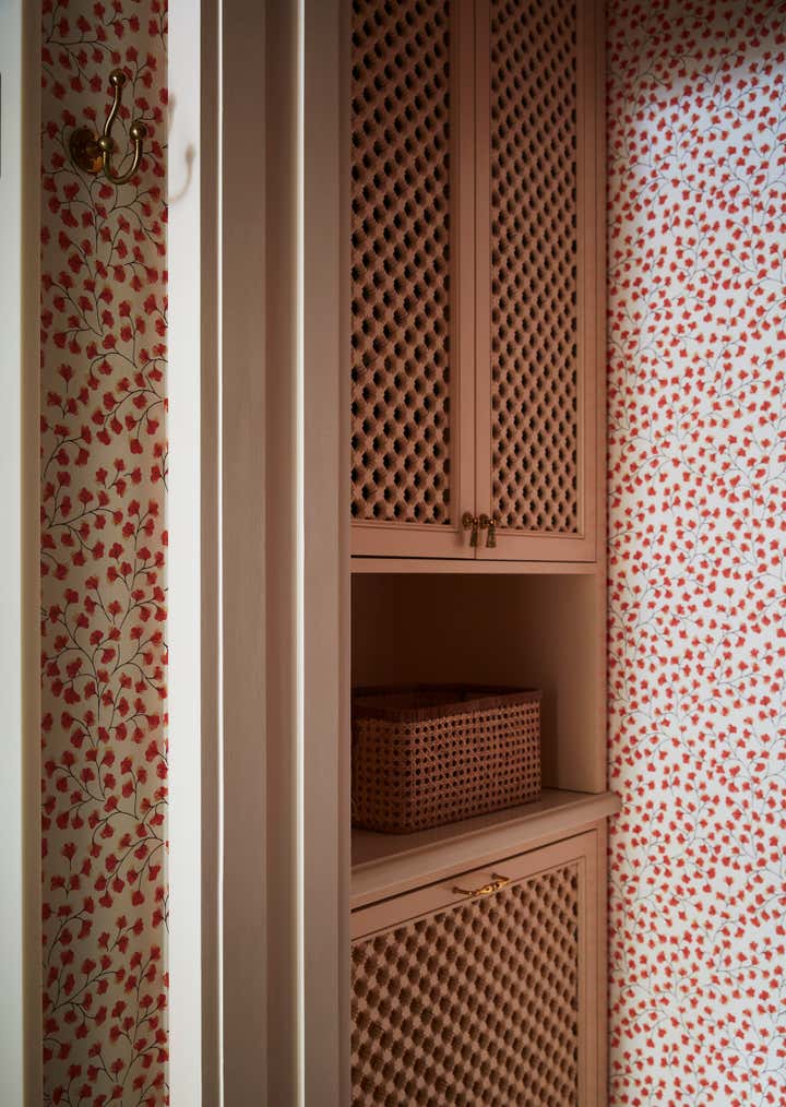 The primary bedroom and bathroom were also enlarged and reconfigured. We created a walk-through dressing area and installed an elegant floral silk wallpaper to conceal the doors.