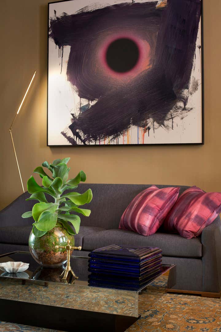 A large-scale Dan Christiansen painting hangs above a Dmitry Co sofa with magenta tie-dyed pillows that coordinate with the painting above.