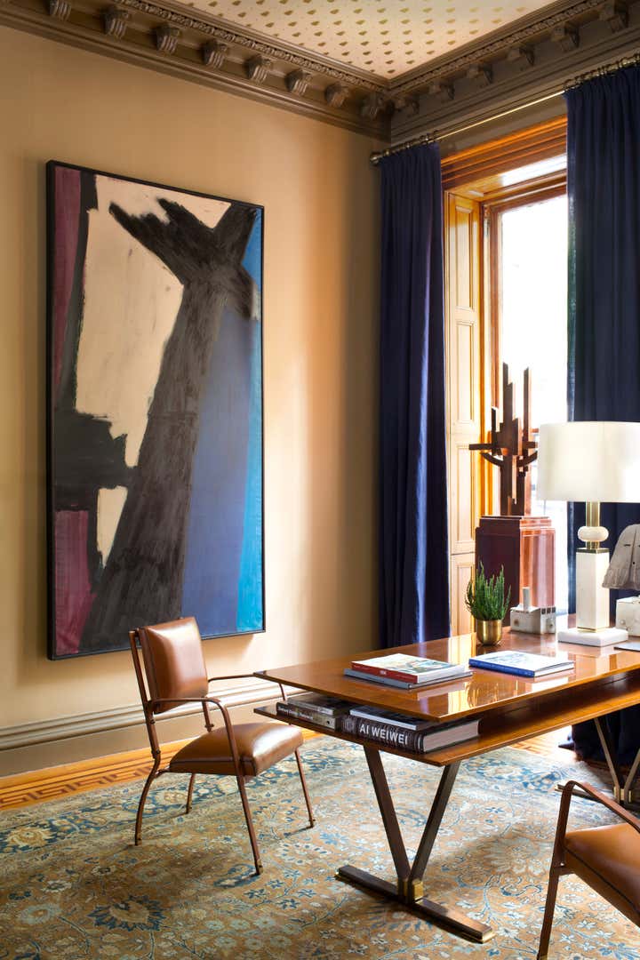 The 1959 Judith Godwin painting pairs beautifully with the Jules Leleu modernist desk and pair of Jacques Adnet chairs. The rusted steel Marino di Teana sculpture from Maison Gerard sits proudly on a pedestal in the window.