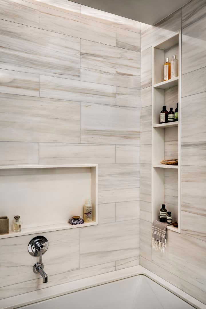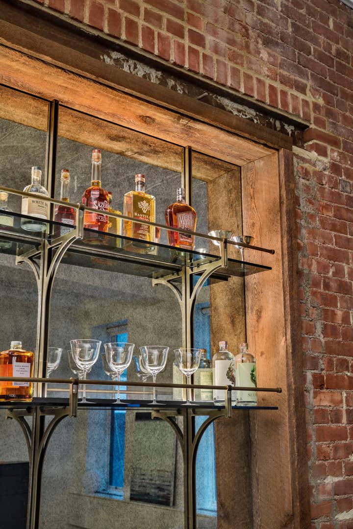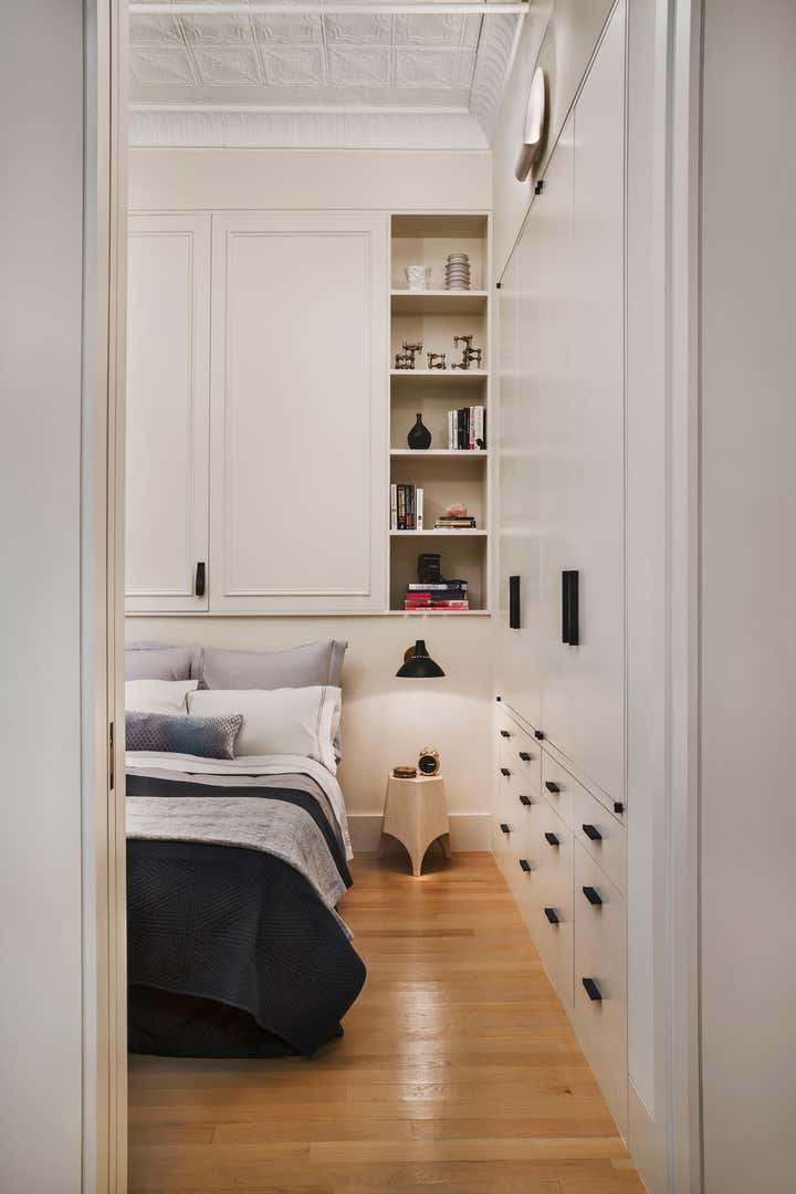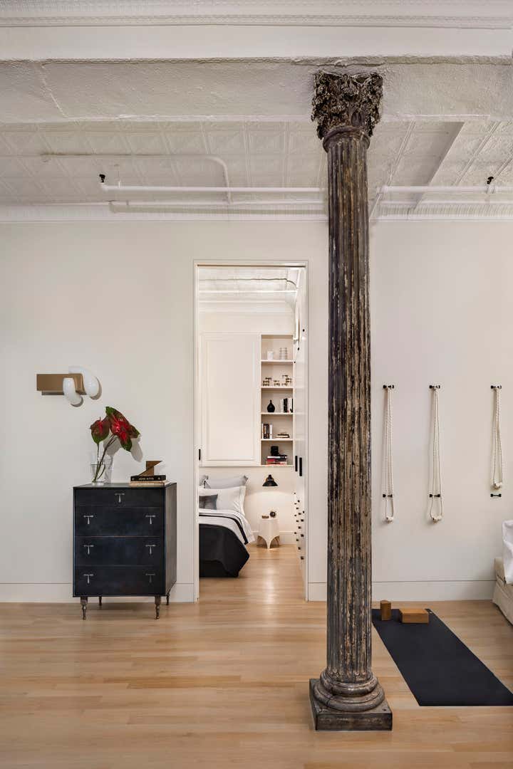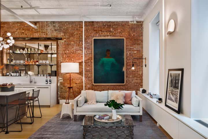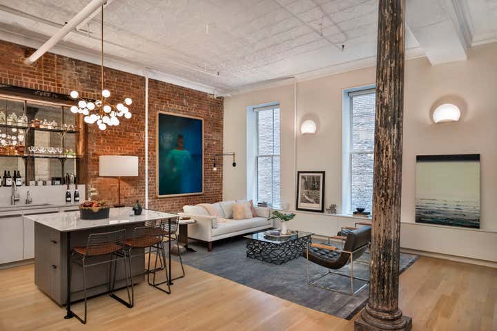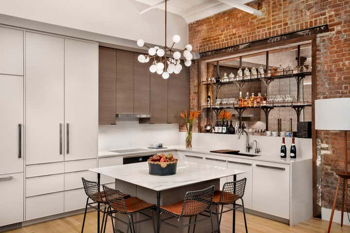 The Broome Street Loft is a beautiful example of a classic Soho loft conversion. The design highlights its historic architecture of the space while integrating modern elements. The 14-foot-high tin ceiling, metal Corinthian columns and iconic brick wall are contrasted with clean lines and modern profiles, creating a captivating dialogue between the old and the new. The plan was completely revised: the bedroom was shifted to the side area to combine the living room and kitchen spaces into a larger, open plan space. The bathroom and laundry also shifted to a more efficient layout, which both widened the main living space and created the opportunity to add a new Powder Room. The high ceilings allowed for the creation of a new storage space above the laundry and bathroom, with a sleek, modern stair to provide access. The kitchen seamlessly blends modern detailing with a vintage style. An existing recess in the brick wall serves as a focal point for the relocated Kitchen with the addition of custom bronze, steel and glass shelves. The kitchen island anchors the space, and the knife-edge stone countertop and custom metal legs make it feel more like a table than a built-in piece. The bathroom features the brick wall which runs through the apartment, creating a uniquely Soho experience. The cove lighting throughout creates a bright interior space, and the white and grey tones of the tile provide a neutral counterpoint to the red brick. The space has beautiful stone accents, such as the custom-built tub deck, shower, vanity, and niches.