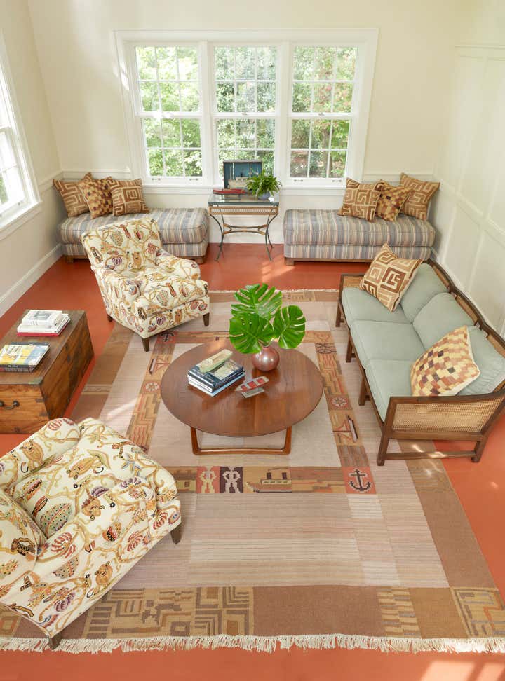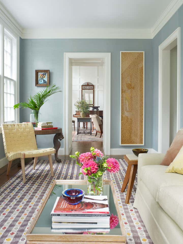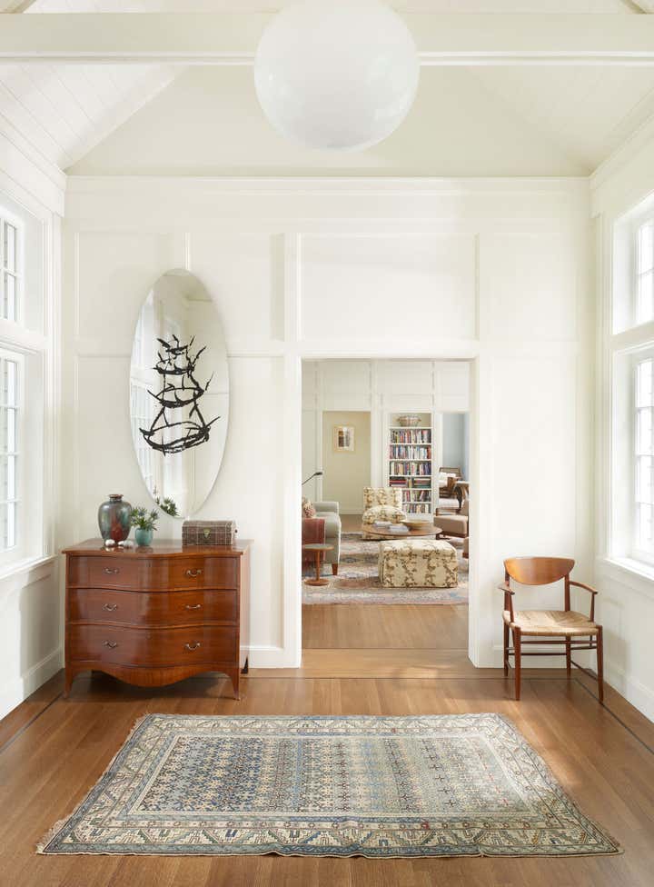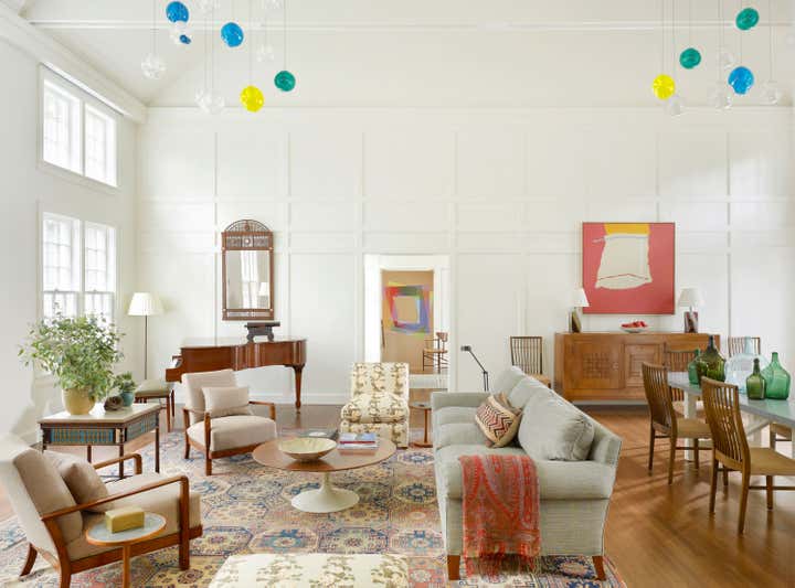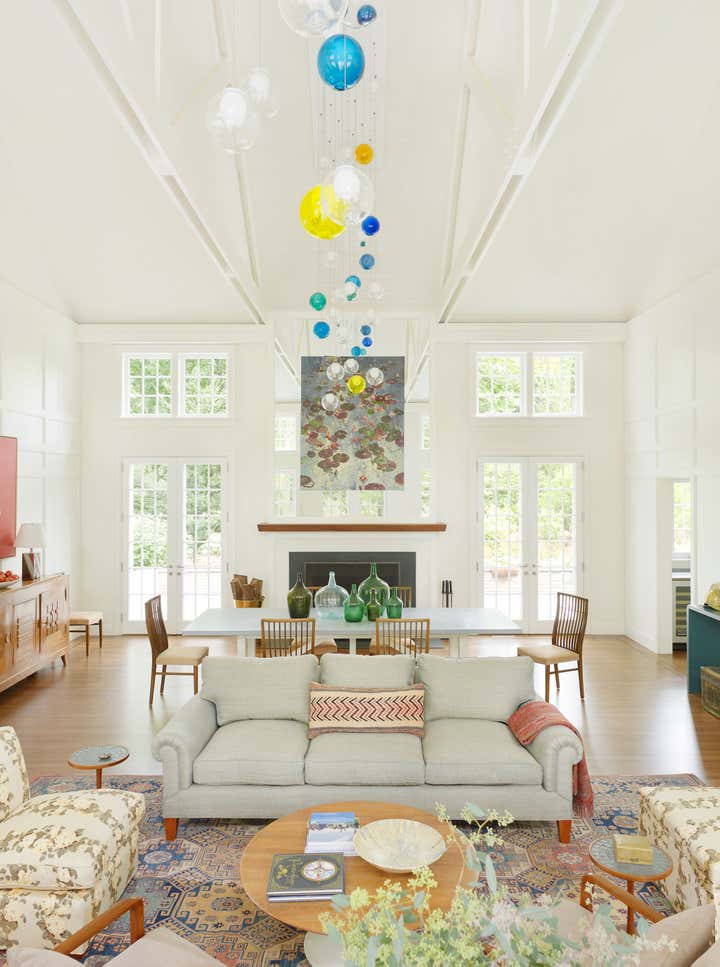 As Thomas Jayne explains, "it s a family house -- the owners wanted it to be harmonious, fresh and contemporary while still fitting into the traditional setting." The cavernous central living and dining room captures the essence of this ideal. Used as the main gathering spot for family members and guests, it is where conversation, piano recitals and group dinners in front of the fireplace take place. The simple wall moldings and exposed ceiling supports, all painted white, are contemporary versions of those found in classic country house, and bring the room a human scale. The paneling also forms an ideal backdrop for hanging the vibrant, animated contemporary art that the family collects. The furnishings come from a wide span of styles and periods, each item forming a connection with the other parts of the room, making it richer, visually interesting and more enduring. For instance, a pair of modern chandeliers made of mixed glass spheres in bright colors are playful and are complemented by a 19th century Persian carpet with a repeating circular pattern motif - a lively juxtaposition that balances the unexpected with the traditional.