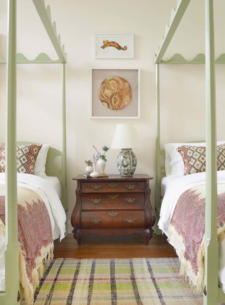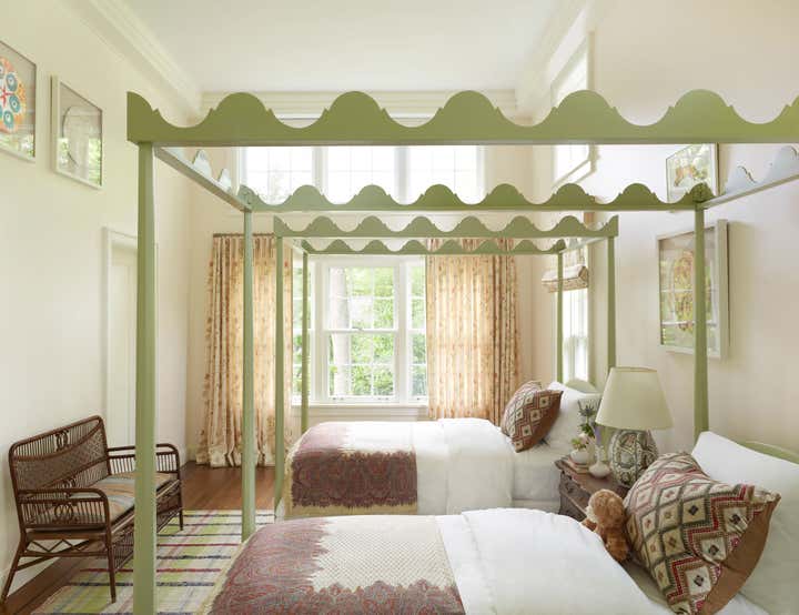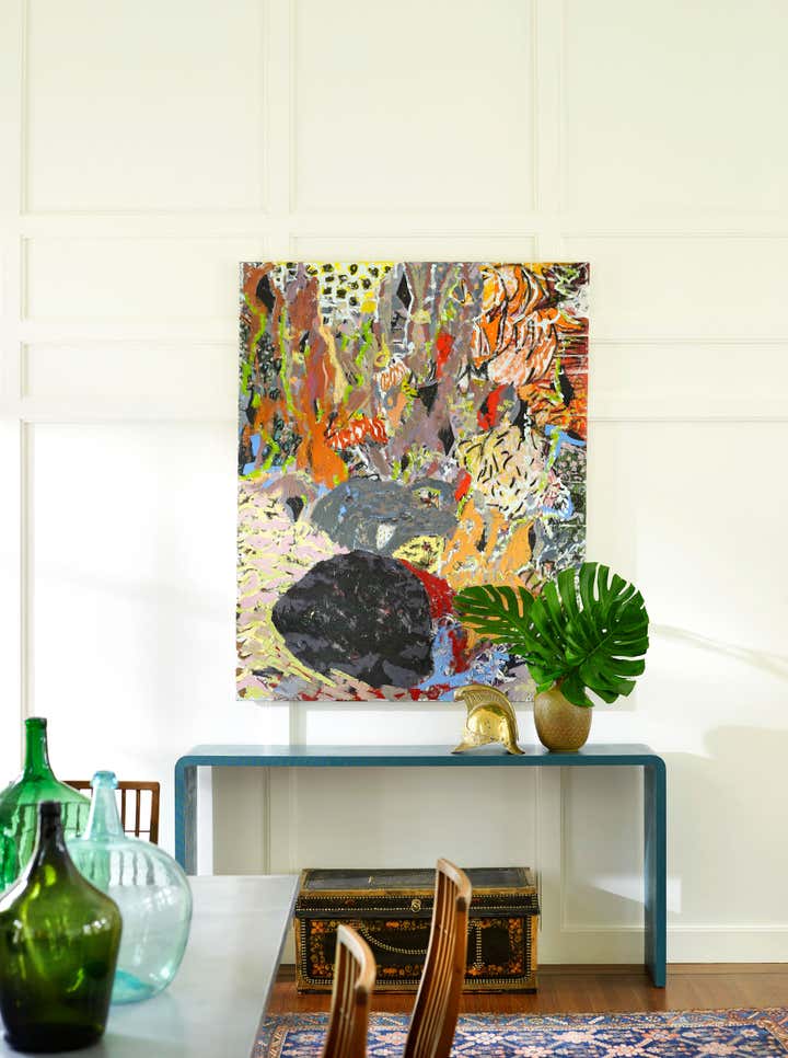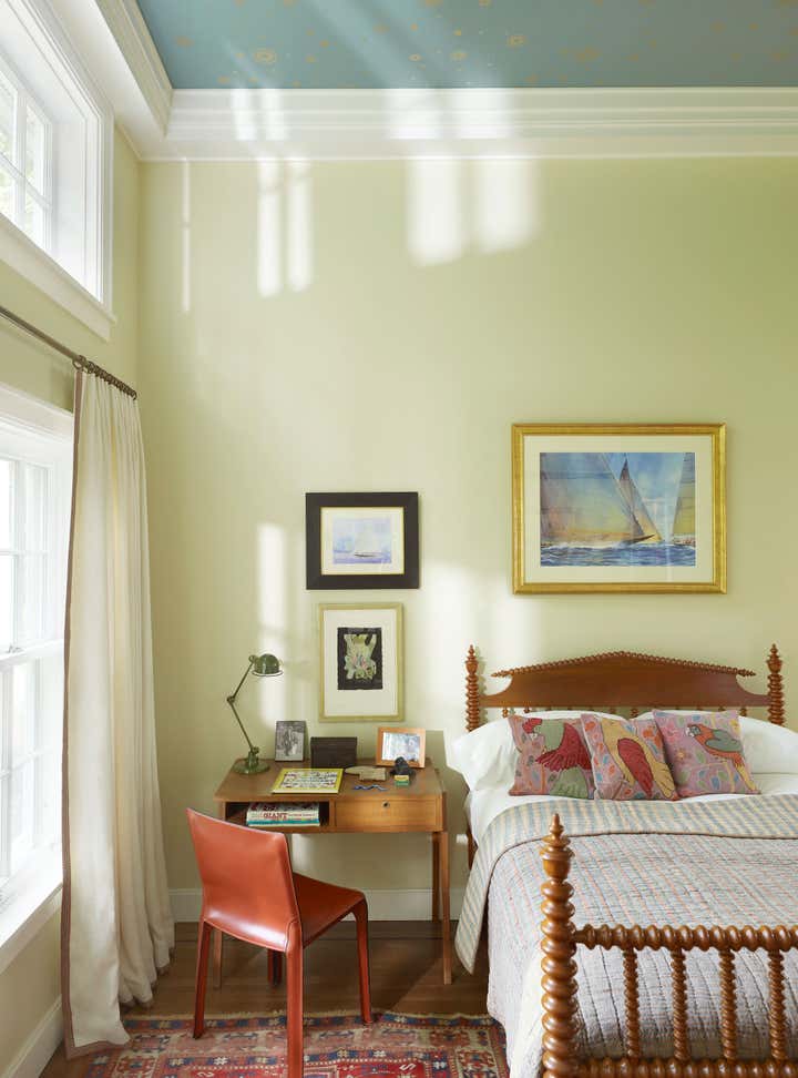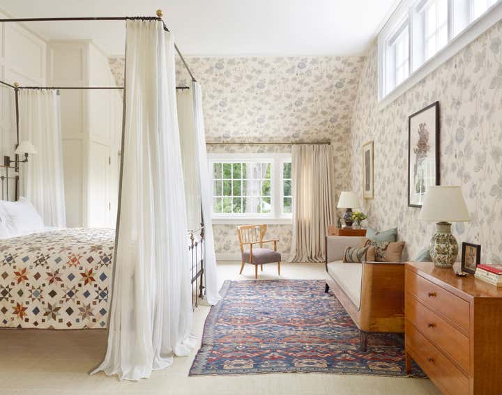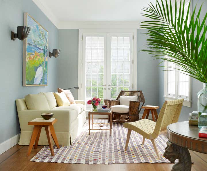 As Thomas Jayne explains, "it s a family house -- the owners wanted it to be harmonious, fresh and contemporary while still fitting into the traditional setting." The cavernous central living and dining room captures the essence of this ideal. Used as the main gathering spot for family members and guests, it is where conversation, piano recitals and group dinners in front of the fireplace take place. The simple wall moldings and exposed ceiling supports, all painted white, are contemporary versions of those found in classic country house, and bring the room a human scale. The paneling also forms an ideal backdrop for hanging the vibrant, animated contemporary art that the family collects. The furnishings come from a wide span of styles and periods, each item forming a connection with the other parts of the room, making it richer, visually interesting and more enduring. For instance, a pair of modern chandeliers made of mixed glass spheres in bright colors are playful and are complemented by a 19th century Persian carpet with a repeating circular pattern motif - a lively juxtaposition that balances the unexpected with the traditional.
