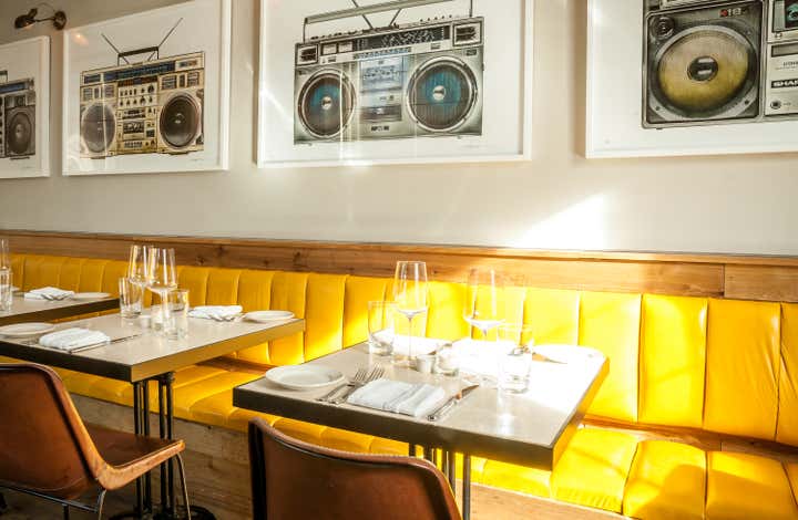 The walls are now a combination of reclaimed white ash and exposed brick. The new bar is made of polished marble and the café tables are well spaced and fitted with comfortable designer chairs covered in hand-sewn leather. The narrow space is outfitted, with squash-colored banquettes and Lyle Owerko’s blown-up photographs of vintage boomboxes shot like Avedon portraits.