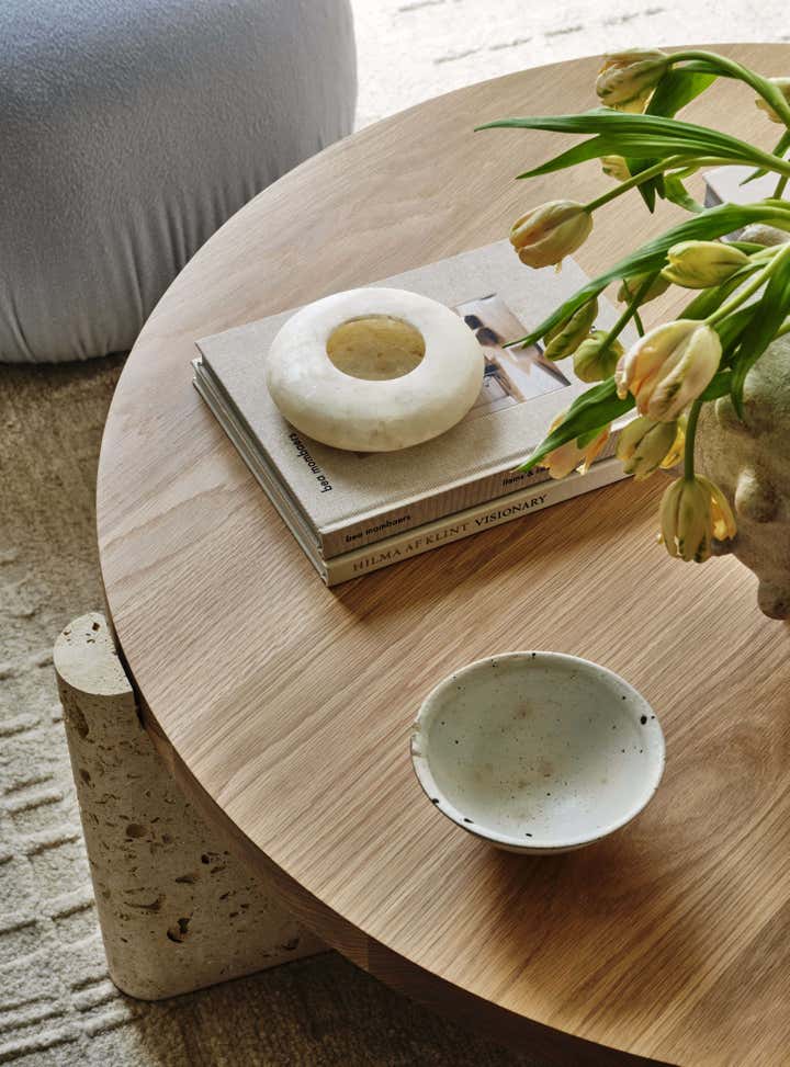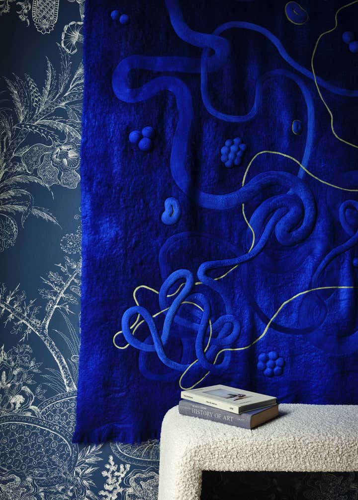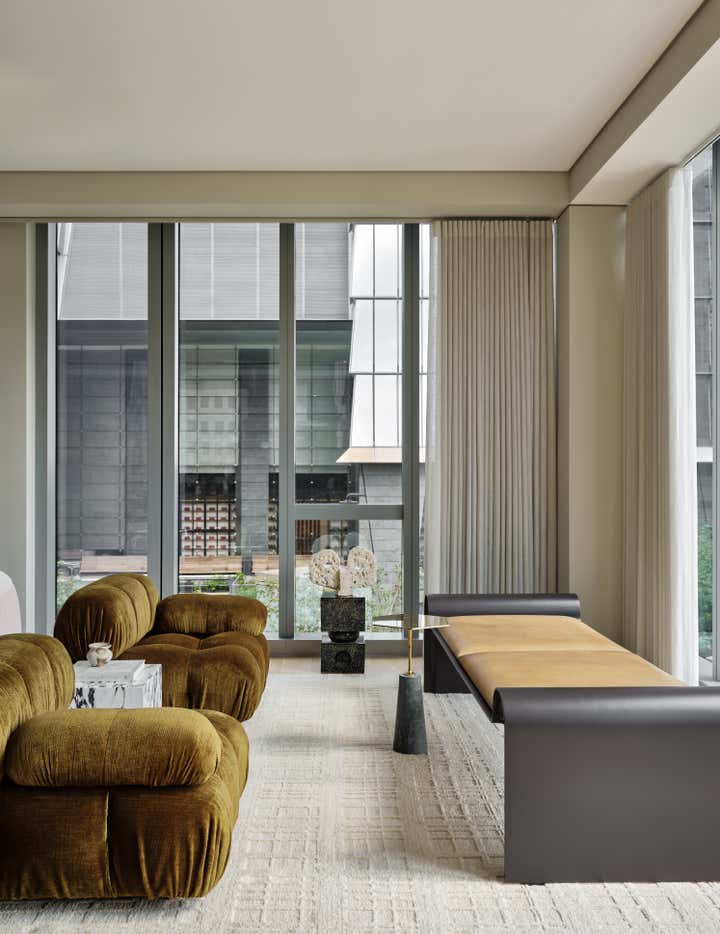 Designed around a request that all seating be beautiful and “nappable”—such as the 280 Sofa in Teddy mohair and custom Monarch bench—Lucy and the team arranged the open floor plan of the light-filled space into zones for entertaining and everyday living. Curved shapes and soft textures create an easy flow between the living and dining areas. Warm colors, like ochre and terracotta, set the mood. A custom desk and daybed were designed for the study ensuring that every detail of the space was given careful consideration. Botanical wallcoverings in rich colors in the bedrooms and study create a pronounced separation from the subdued and earthy tones in the common areas, lending a feel of a home-away-from-home.