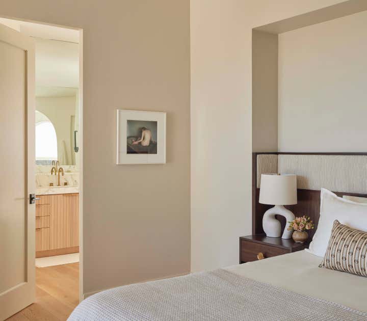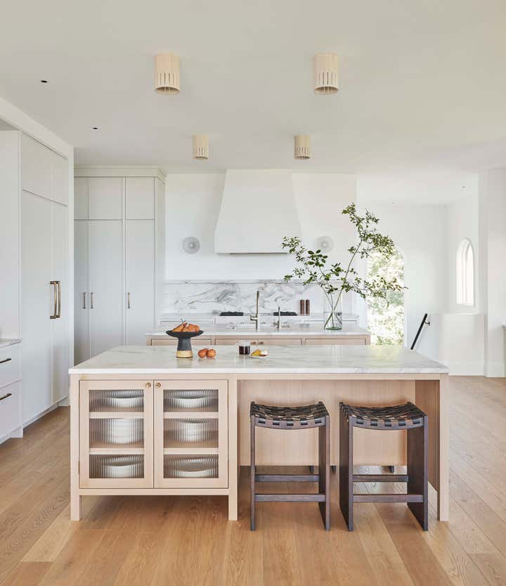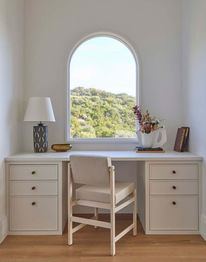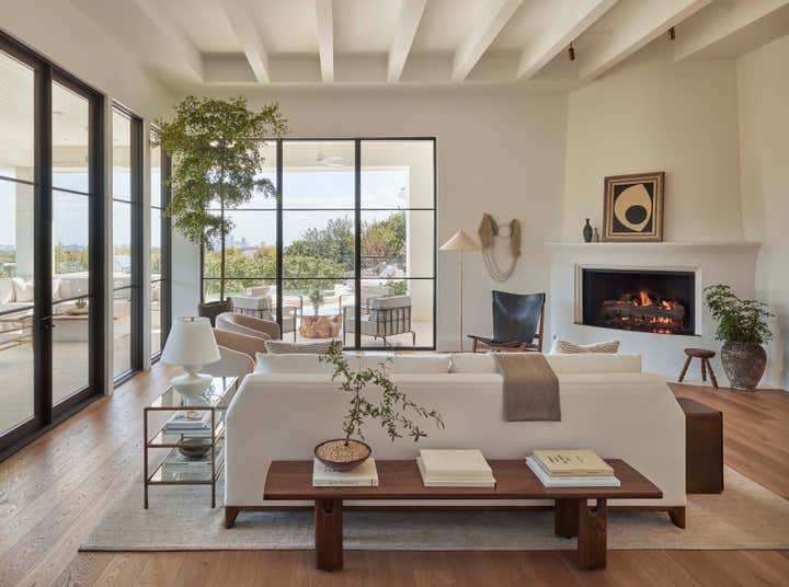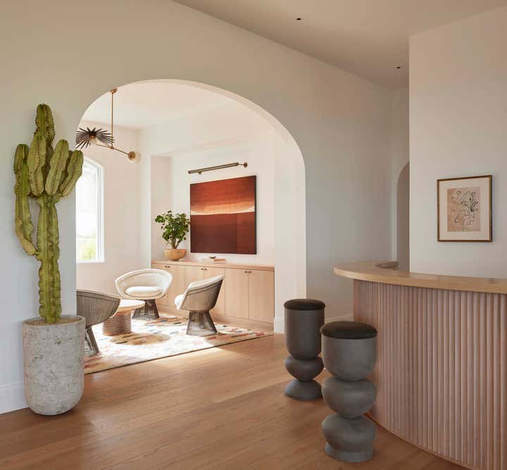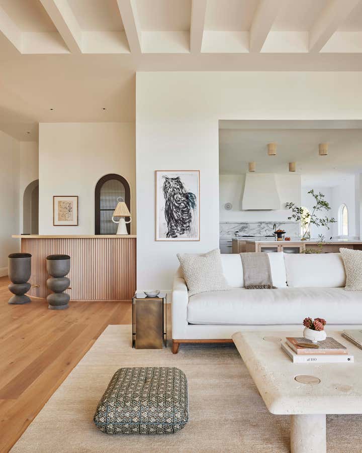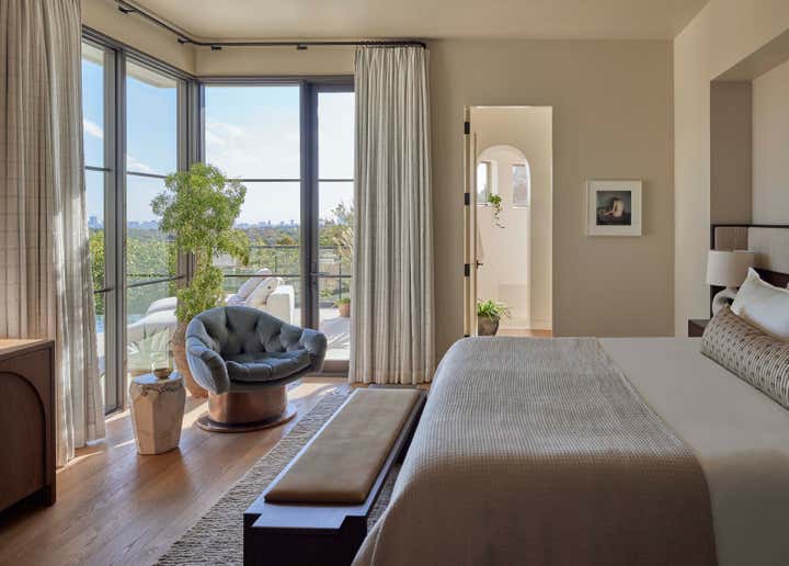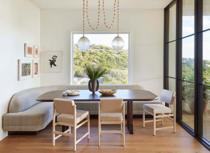 Transforming the rustic bones of this Austin, Texas project into a calming, California-inspired space was a feat that required an extensive rework of materials and textures. While much of the original layout was maintained, Ekeland s team sought to replace the existing dark wood and heavy beams with lighter walls, natural fibers and warm metals. The results offered a bright home with a curvaceous flow and calming aesthetic.