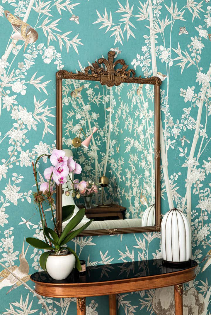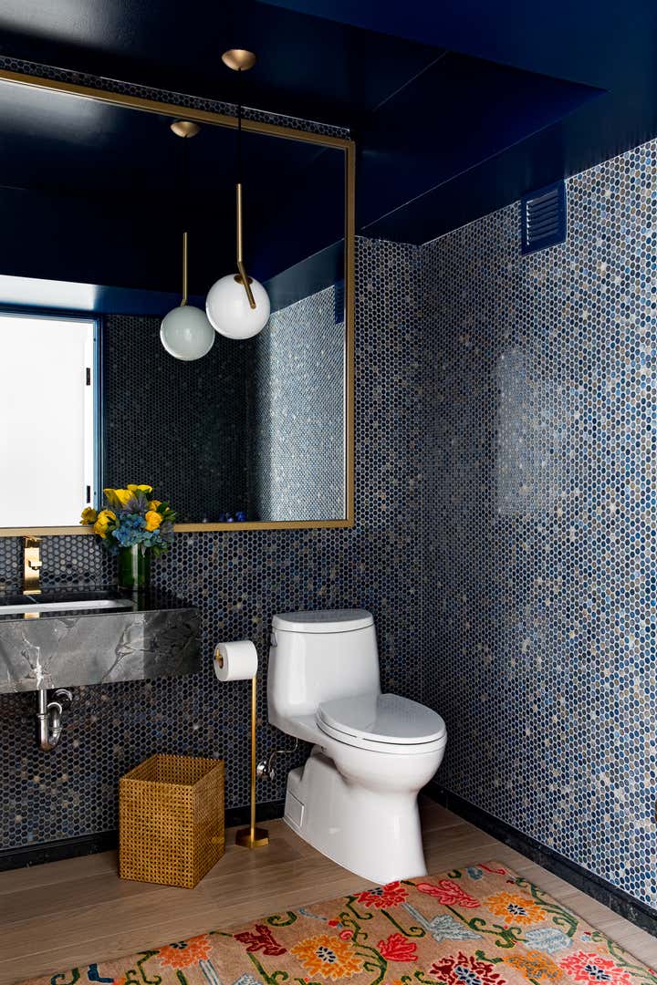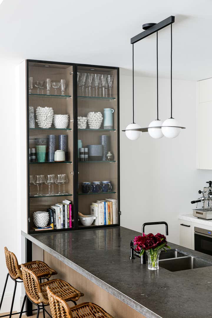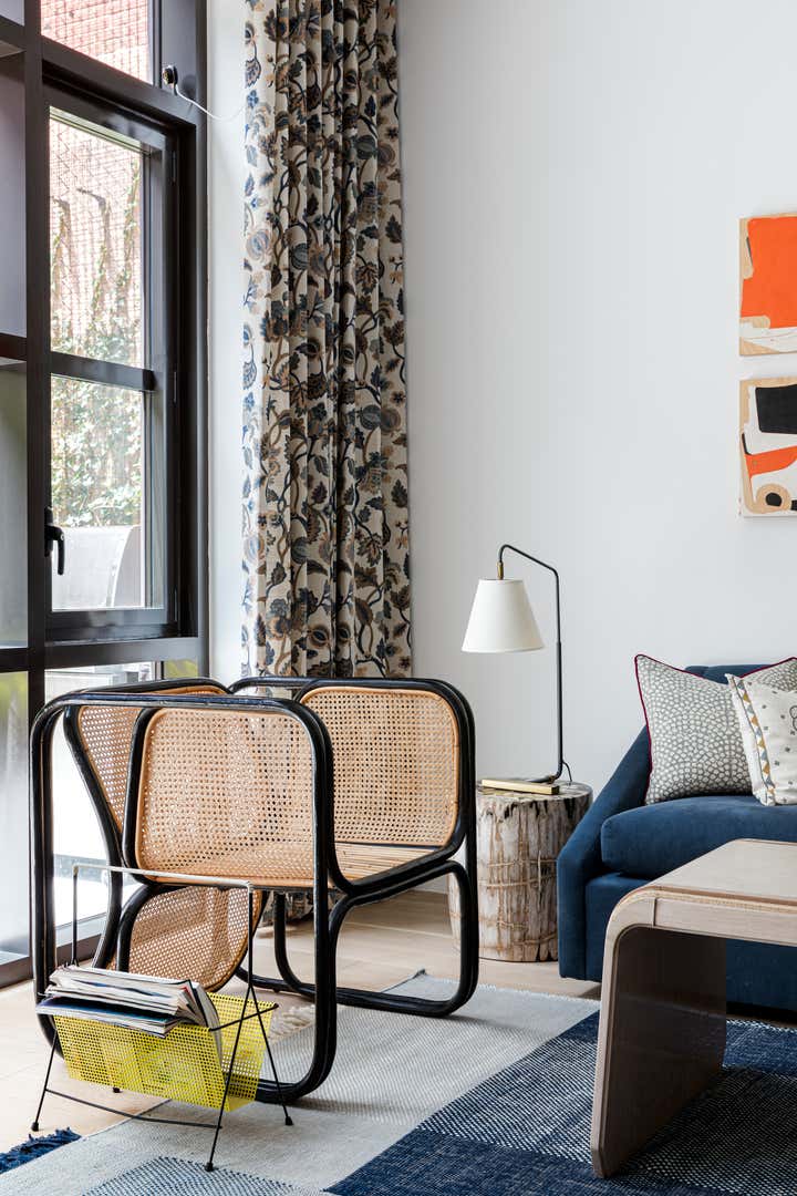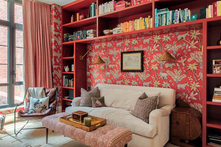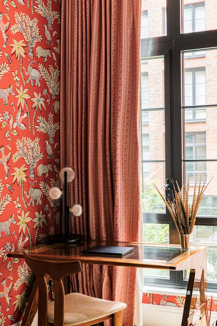 Each room in this east village duplex has its own distinct style. It was a pleasure working with clients who were open to mixing aesthetics to endow each space with uniqueness. I love how we contrasted the cool colors of the kitchen / living / dining room with the warm colors of the den. My client’s husband was raised in England and we used his background as design inspiration. British dens are traditionally wood-paneled or painted in bold colors, so we used a red paint for the built-ins and the wallpaper as an homage to his home country.