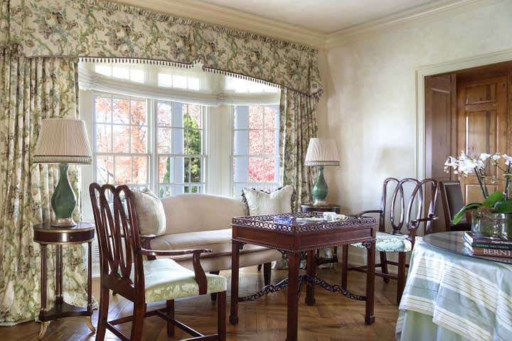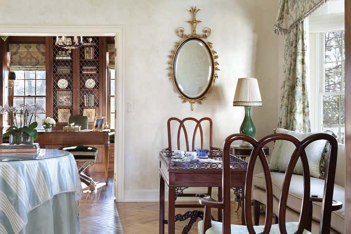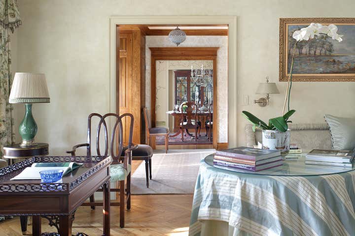 A fresh and modern vision for English country living with exacting attention to custom details such as herringbone floors, lamp shades, drapery and a custom-built banquette that provides a hint of the modern in the midst of classic country refinement. From arresting open-back chairs curated for their sculptural quality to carefully rusticated wall finishes that provide a palette for aged-glass mirrors flanking the entrance to the library, no small detail is left unattended. Design inspiration for this petite living room emerged from an emphasis on creating compelling vistas and marrying form and function between this little charmer and its adjoining library, foyer and dining room. For a client who required a fresh take on the charm and subtle sophistication of an English country living room without any of the stuffiness, only the most impeccable design choices would suffice.