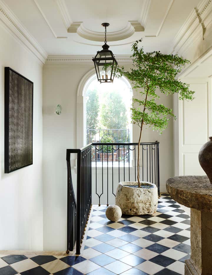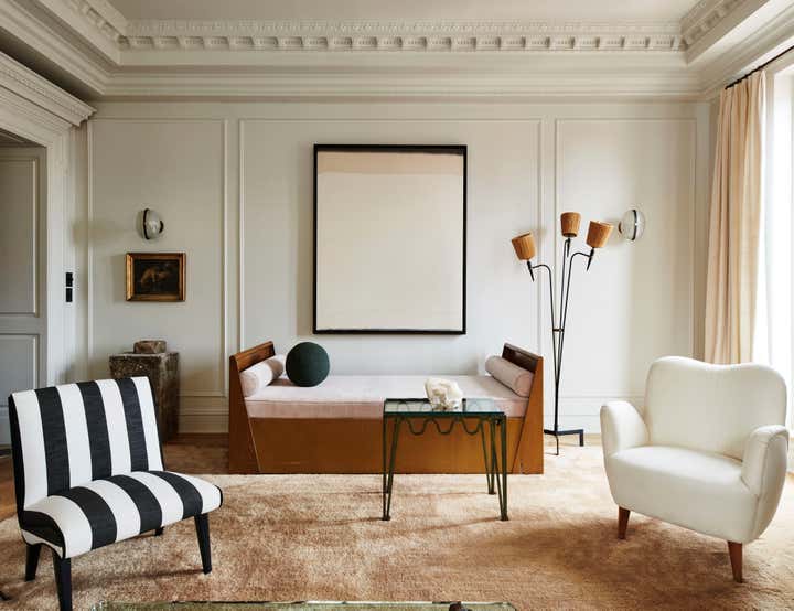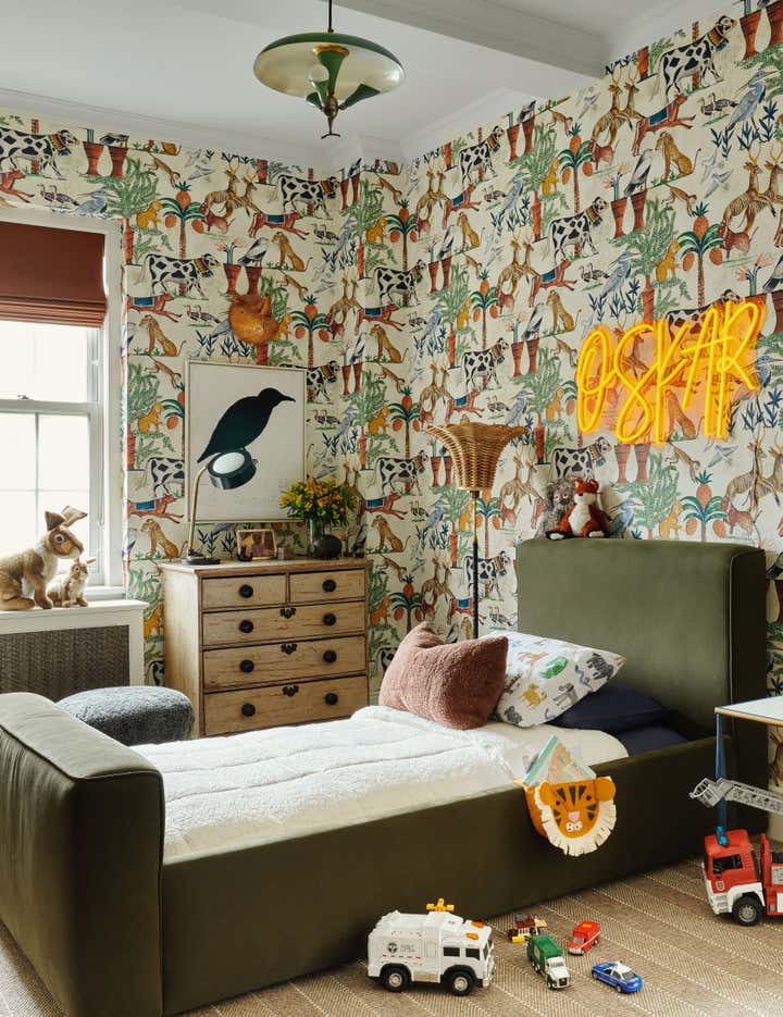 One new treasure is a Carlo Bugatti chair Berkus gifted Brent for his birthday last year. In the kitchen, subway tile was removed from the walls, the formerly black cabinetry has been lightened to white, and the butcher block on the countertops and the brass wrapping the island have been replaced with Calacatta Paonazzo marble. And while the public rooms are bathed in creamy neutrals that allow the architectural details and furniture to star, the bedrooms each feature bold wallpapers that cocoon their inhabitants.
