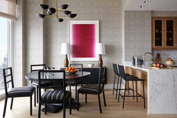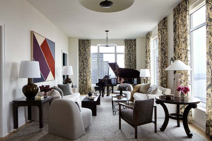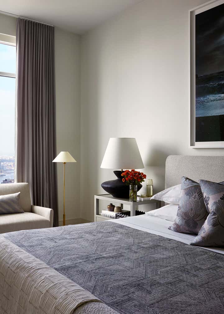 Soaring views and a soothing palette join forces at this sprawling high rise apartment in lower Manhattan.
