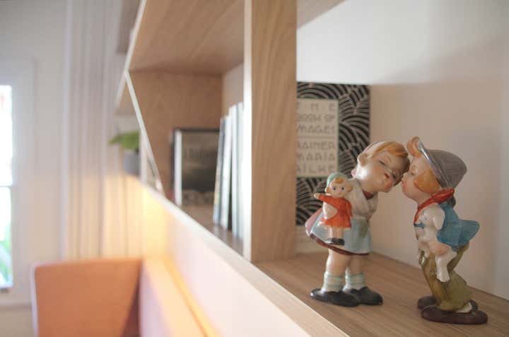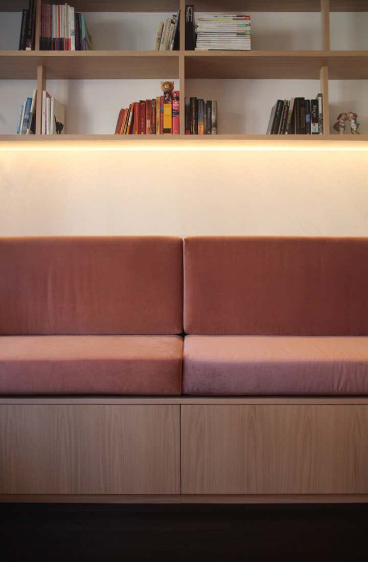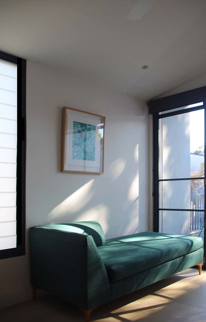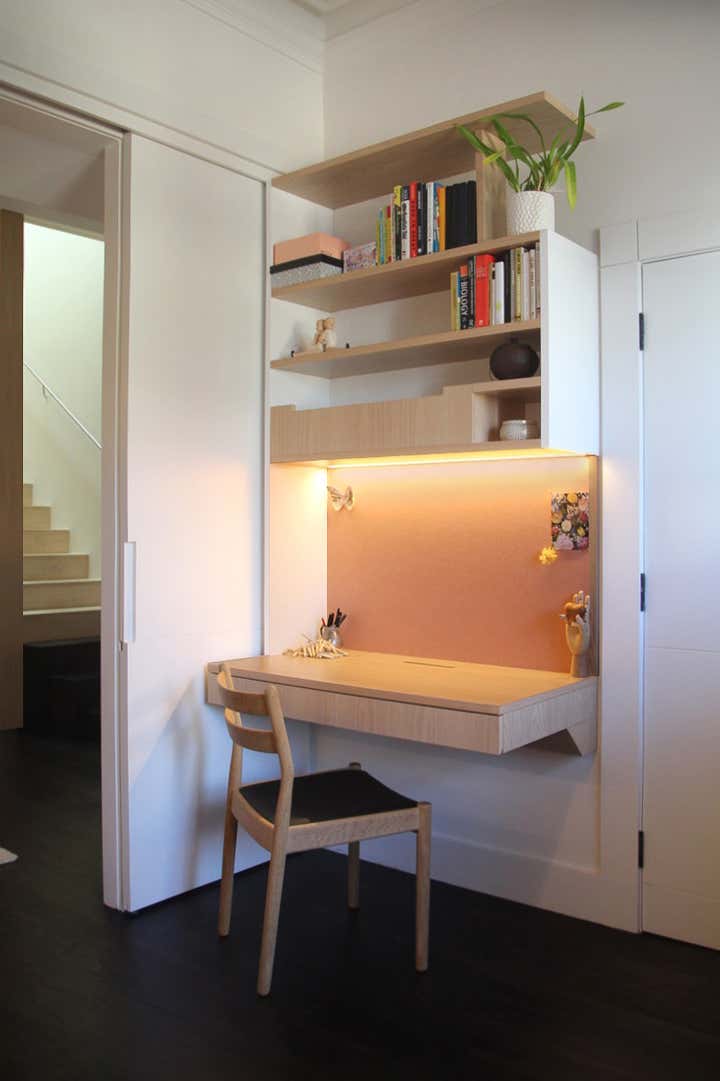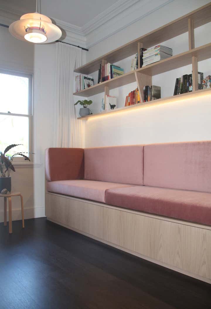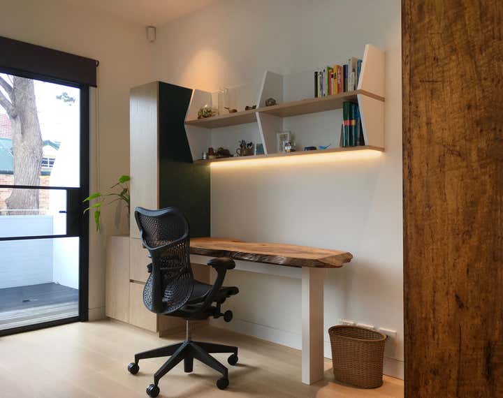 This project, in a beautifully adapted terrace house by architects Stanic Harding, entailed the design and fit-out of 2 home office spaces. The clients are a pair of high-flying marine scientist/educators who regularly work from home, requiring more than your average file storage and shelving for research/reading matter. Office One has been designed as a workspace slash library, with a sprawling built-in sofa covered in dusty pink velvet housing 4 large swing-file drawers. The sofa was designed so that the clients can sit one at each end and fully extend their legs, allowing them to lounge, read and relax together. The ultra-wide shelves overhead have varying depths and subtle supports, giving the illusion of lightness despite their strength. Joinery is finished in a combination of lime-washed oak veneer and a simple E0 white melamine hand-painted to match the walls. The compact, floating desk comprises drawers, a hidden cable tray, hidden shelf, open shelving and an apricot-pink pinboard. A vintage Danish oak-framed chair completes the comfortable set-up. In Office Two, form follows function with a tall cabinet housing 18 shelves for filing different active projects, giving this set-up its unusual form. Its side is covered in aquamarine coloured pinboard. Below are 2 swing-file drawers. The desk itself has been created from a large slice of Camphor Laurel timber. This is supported by a single, solid white leg, giving an illusion of a floating organic form which breaks out from the straight-lined joinery and provides a meaningful surface for work and reflection. The Mirra office chair by Herman Miller was chosen for comfort and sustainability. A mid-century sofa, recovered with 100% linen fabric in ocean green completes this new home office, providing a comfortable reading spot.